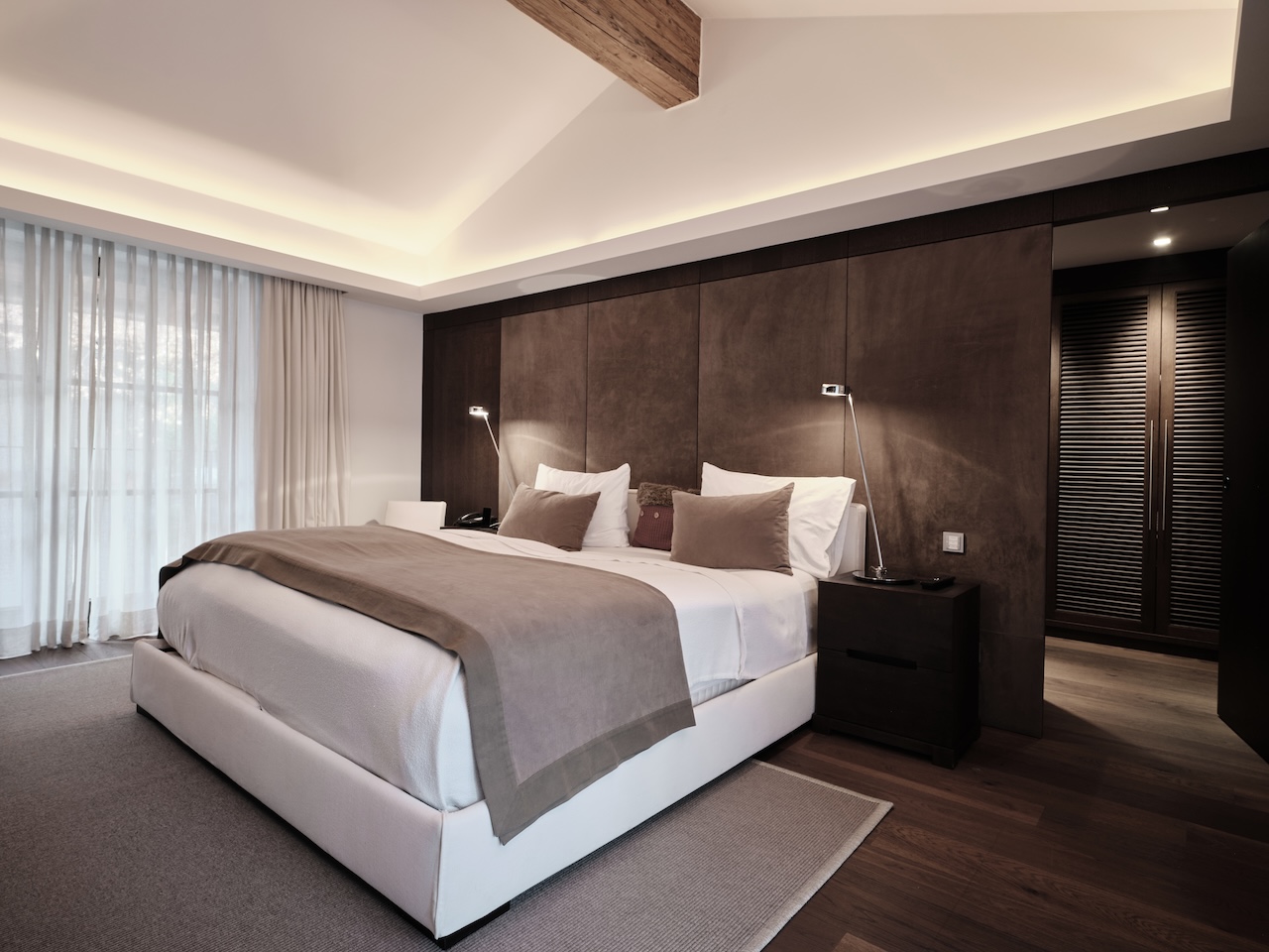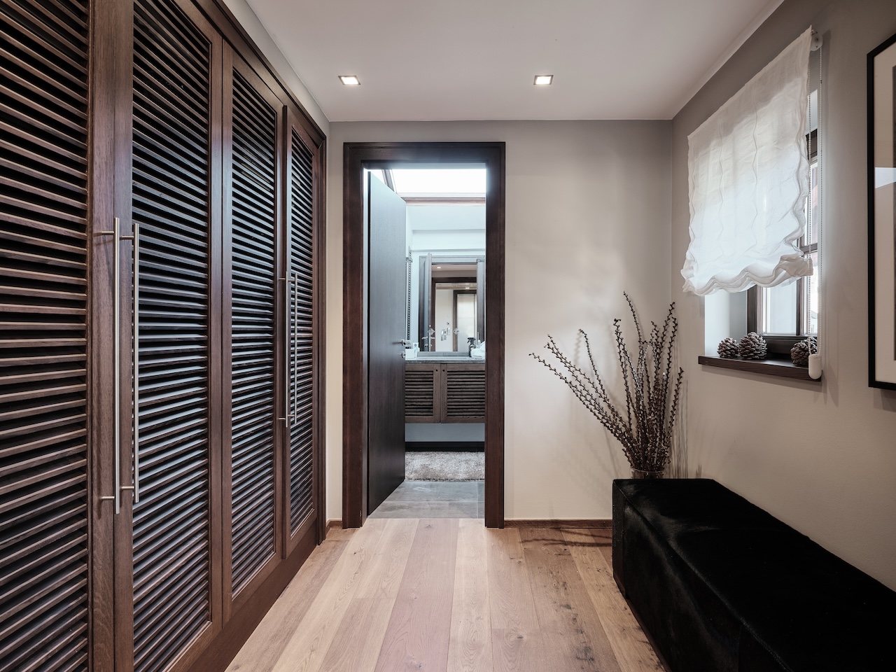 Begleitet vom Sinn für Ästhetik, dem Streben nach technisch ausgeklügelten Feinheiten sowie mit großem Augenmerk auf die perfekte Belichtung, dank der vielen Dachfenster sowie dem intelligenten Lichtkonzept, entstand ein einzigartiges Gesamtwerk. Echte Handwerkskunst, Altholzverkleidungen, Designermöbel, natürliche Materialien und erdige, zur Region passende Farben, verleihen dem Domizil den Ausdruck von anspruchsvoller Eleganz. Namhafte Marken, wie Occhio, Gaggenau, Bose, Pioneer, Miele und Thyssen Krupp stehen für den Anspruch an höchste Qualität smarter Lösungen, wie das Öffnen der Vorhänge via Knopfdruck. Über eine Home-Management-App wird das Bussystem gesteuert. So können beispielsweise Heizung, Licht und Jalousien bequem über Handy oder Tablett aktiviert, deaktiviert oder eingestellt werden.