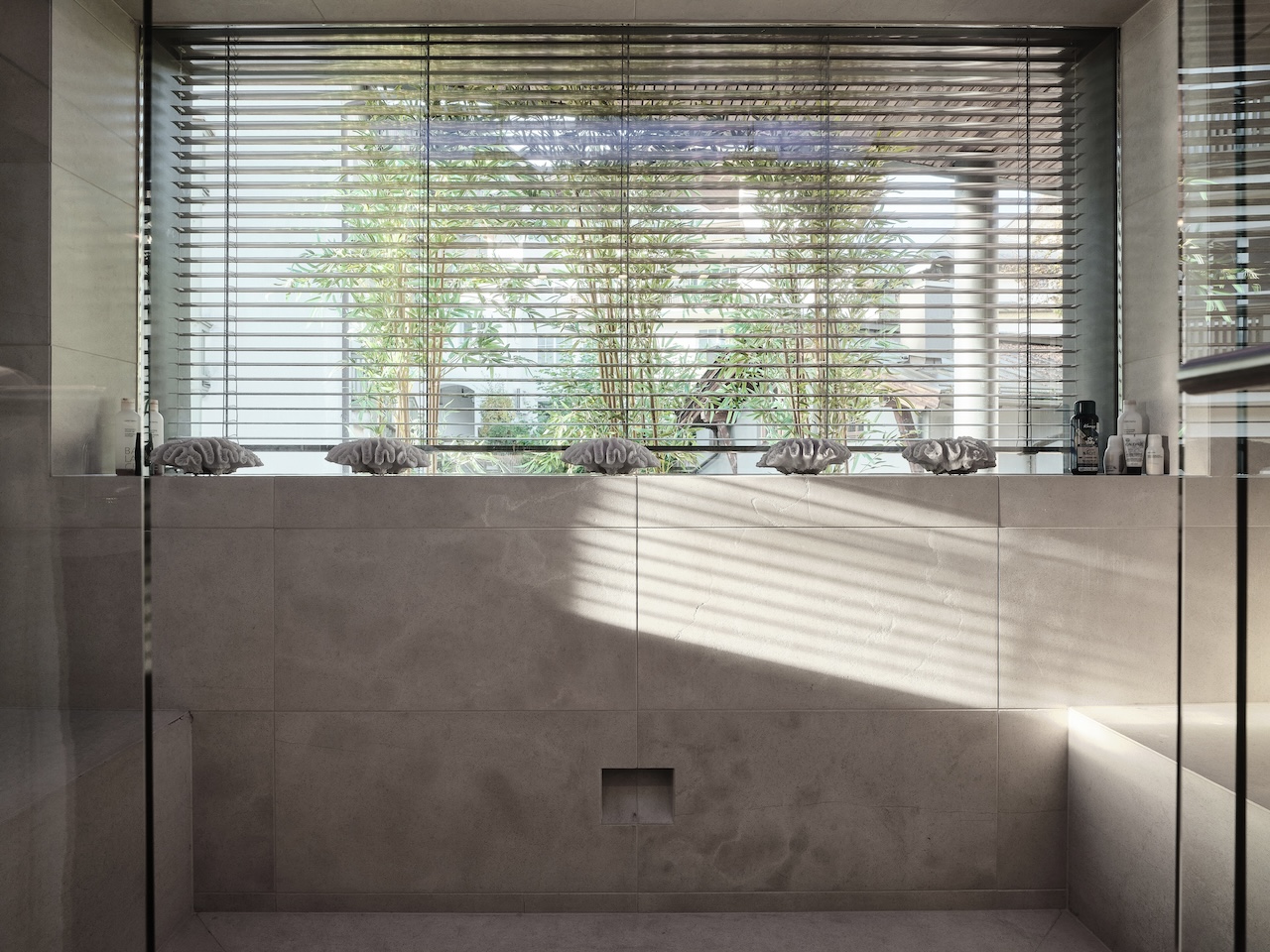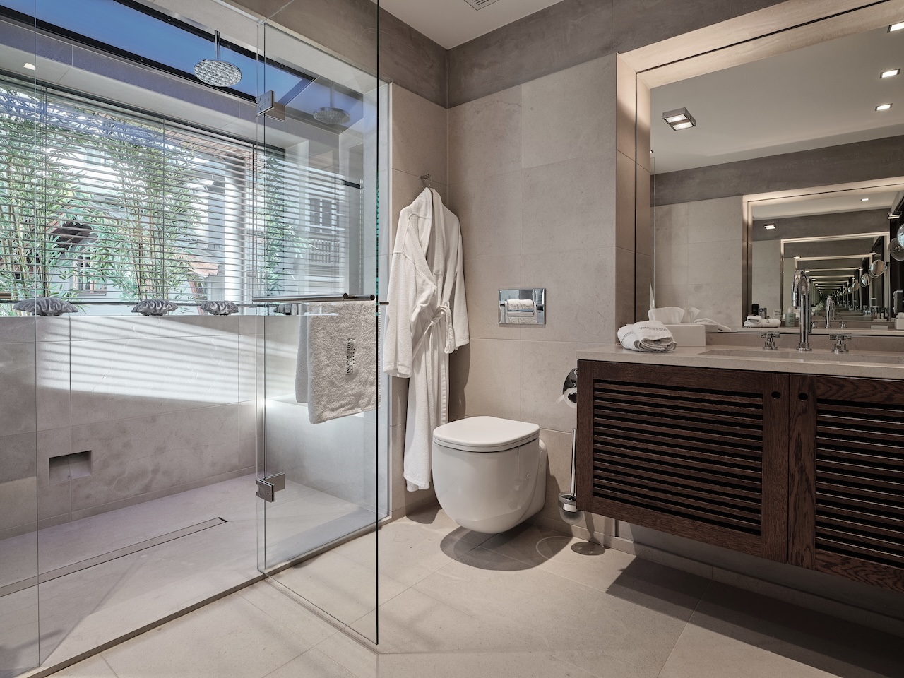 Anschließend zu den vier Schlafzimmern befinden sich jeweils sehr hochwertig ausgestattete Badezimmer im klassisch-eleganten Stil. Sie einen sich in der Auswahl an edlen Armaturen, maßgefertigten Möbeln, exklusivem Feinsteinzeug, großzügigen Duschräumen mit Natursteinplatten, Rainshower, Dampfdusche und Ganzglas- Duschwänden.