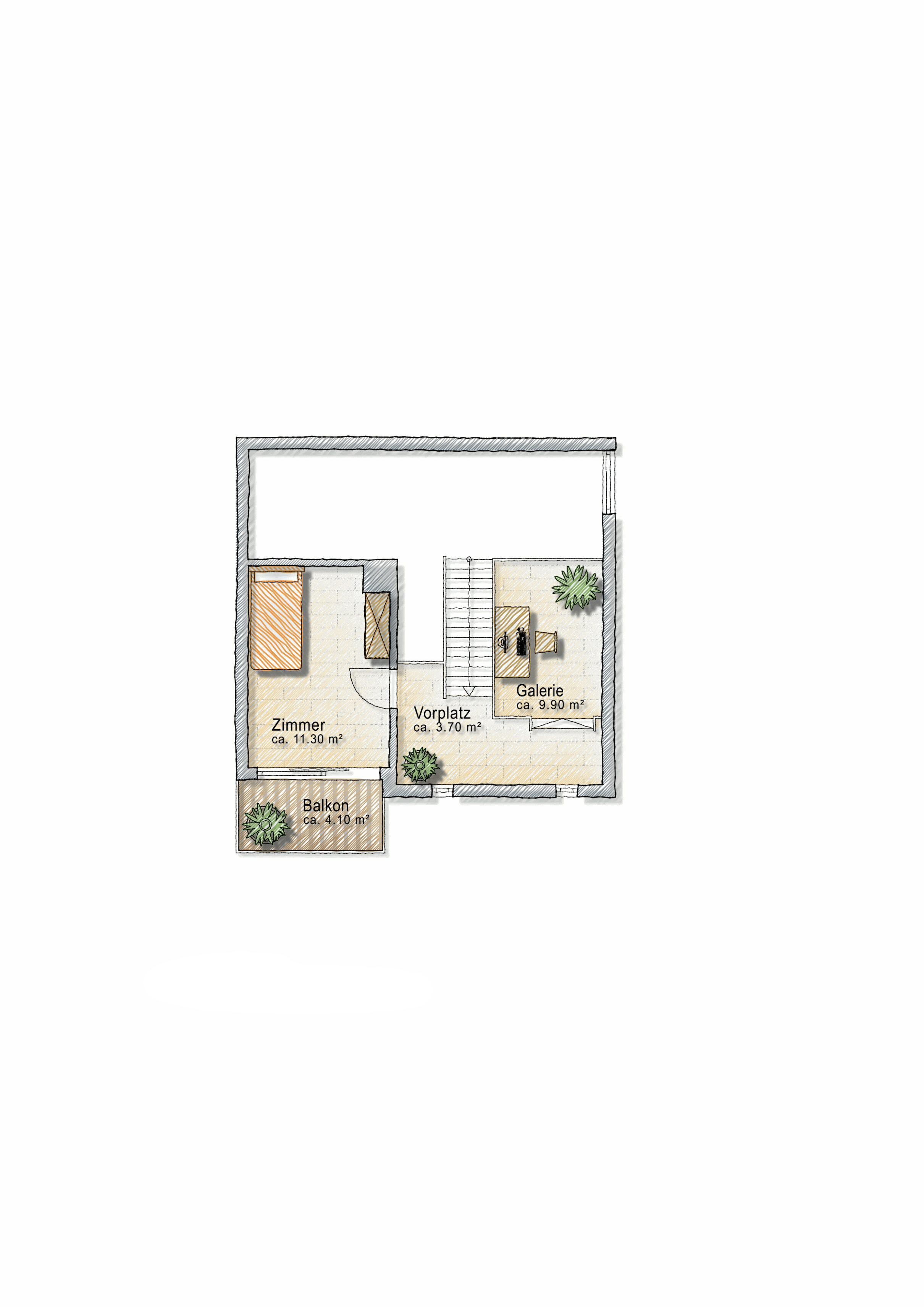 Ein weiterer reizvoller Rückzugsort ist das Zimmer mit eigenem Balkon im Dachgeschoss. Ergänzt wird diese Etage durch eine offene Galerie, die sich ideal als Arbeitsbereich, Musikzimmer oder kreativer Bereich nutzen lässt.