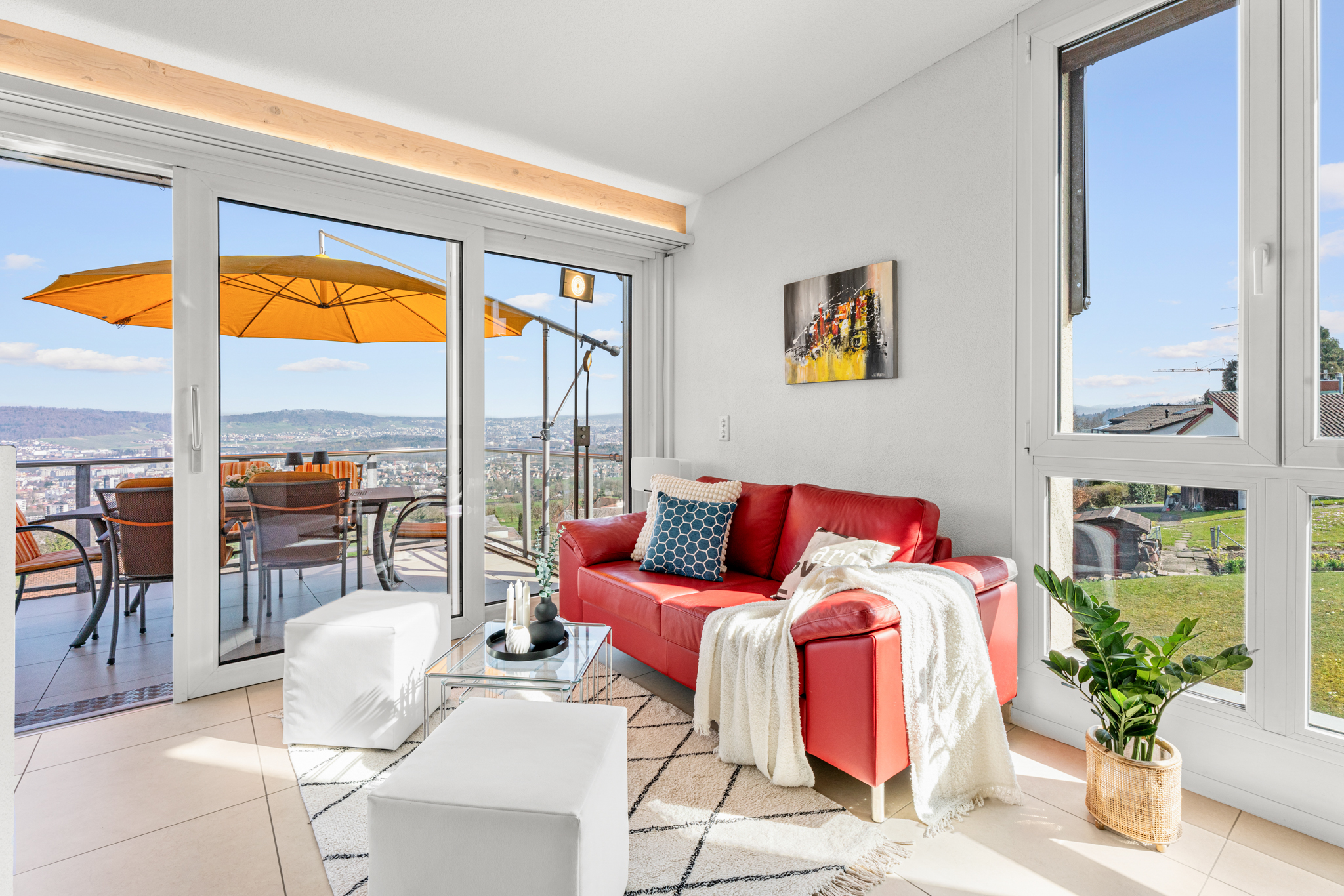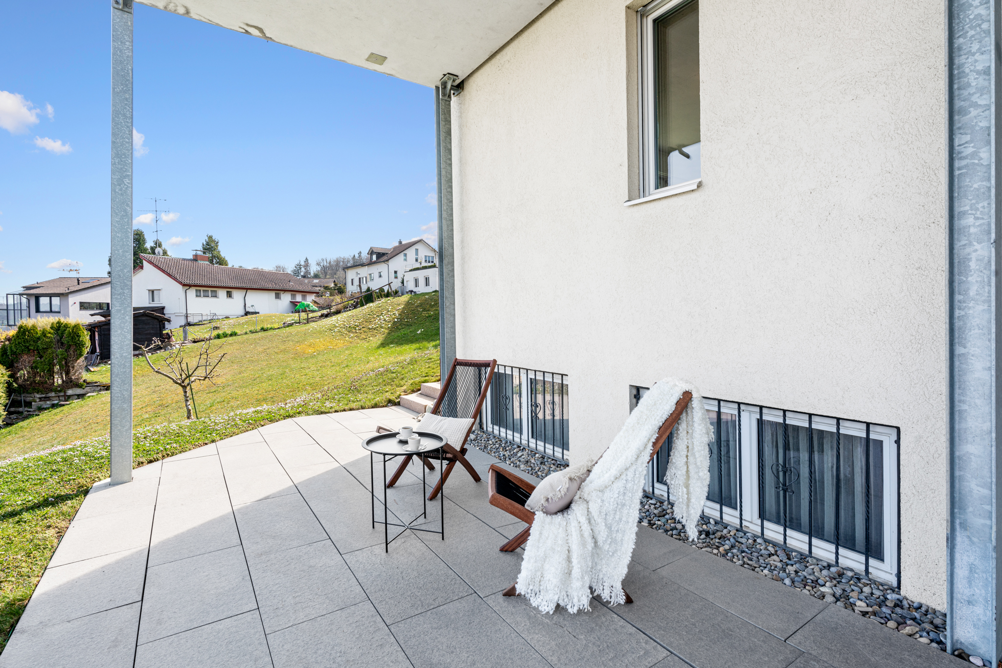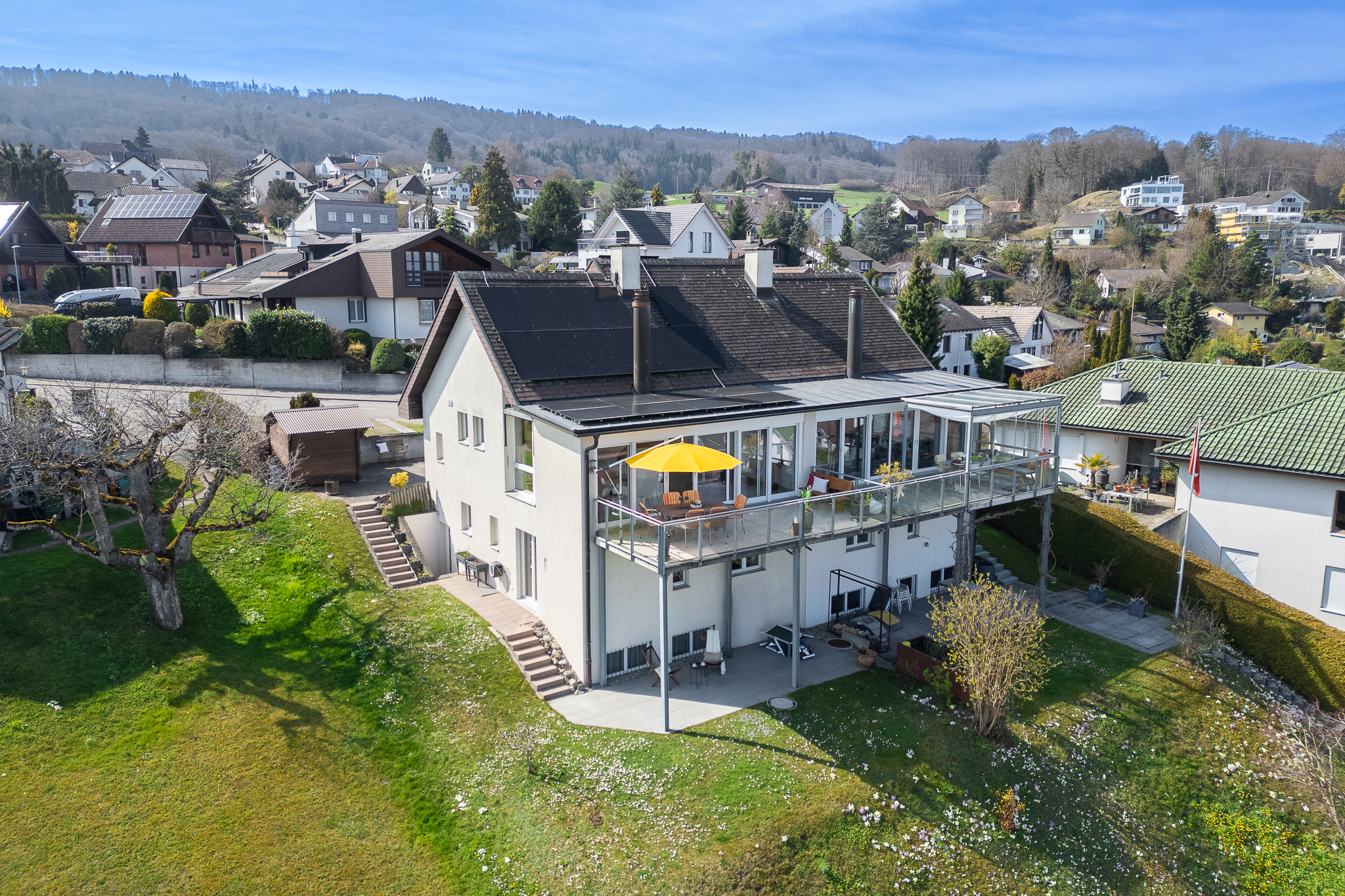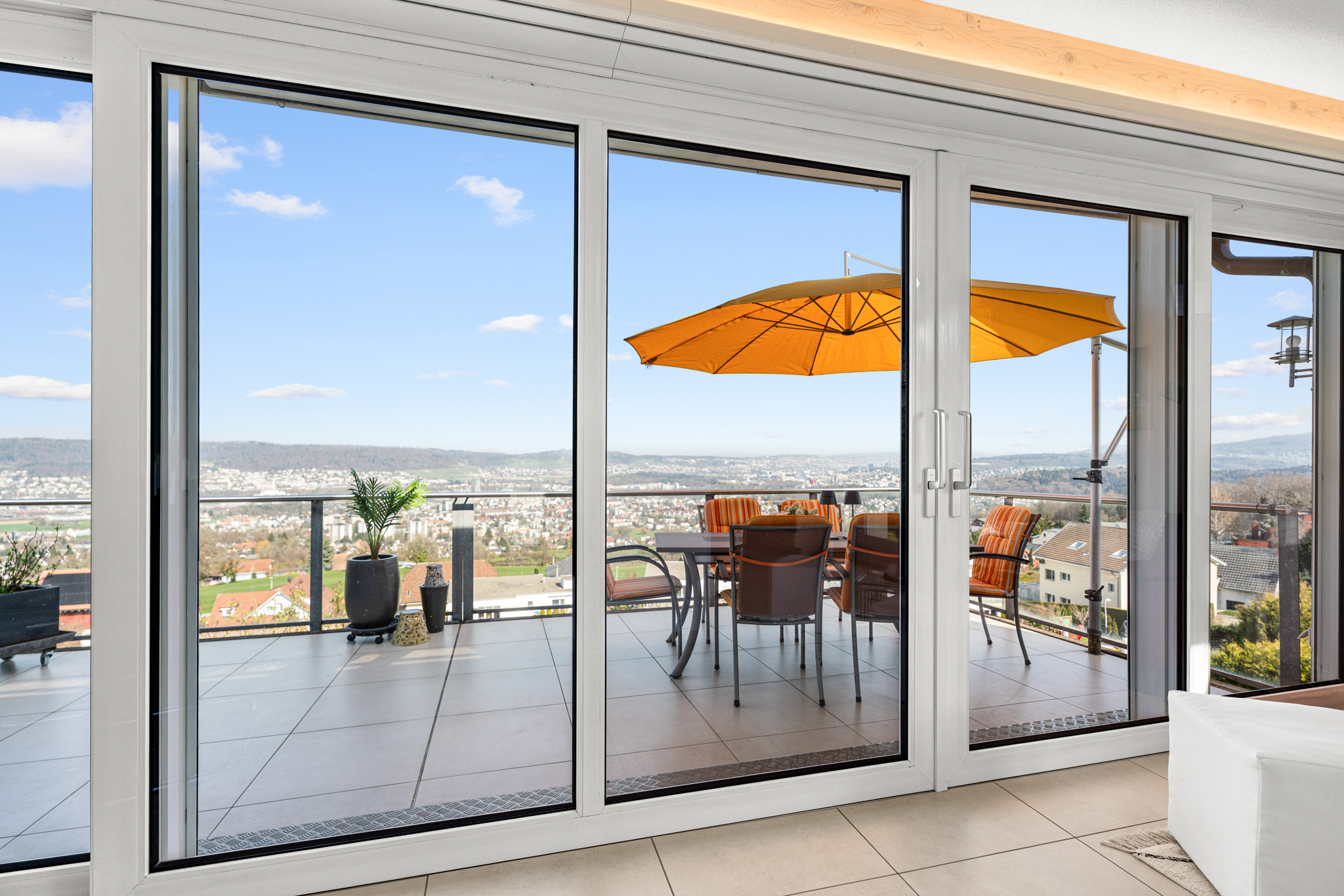 Vor dem Wohnbereich erstreckt sich die grosszügige Terrasse, die mit ihrer unverbaubaren Aussicht und den transparenten Glasgeländern beinahe über dem Hang zu schweben scheint. In den warmen Monaten wird sie zum erweiterten Wohnraum unter freiem Himmel.