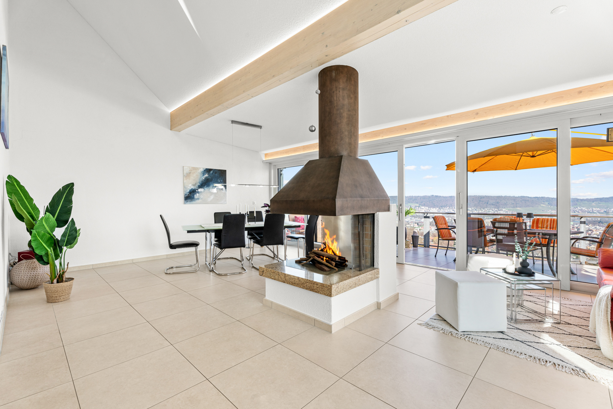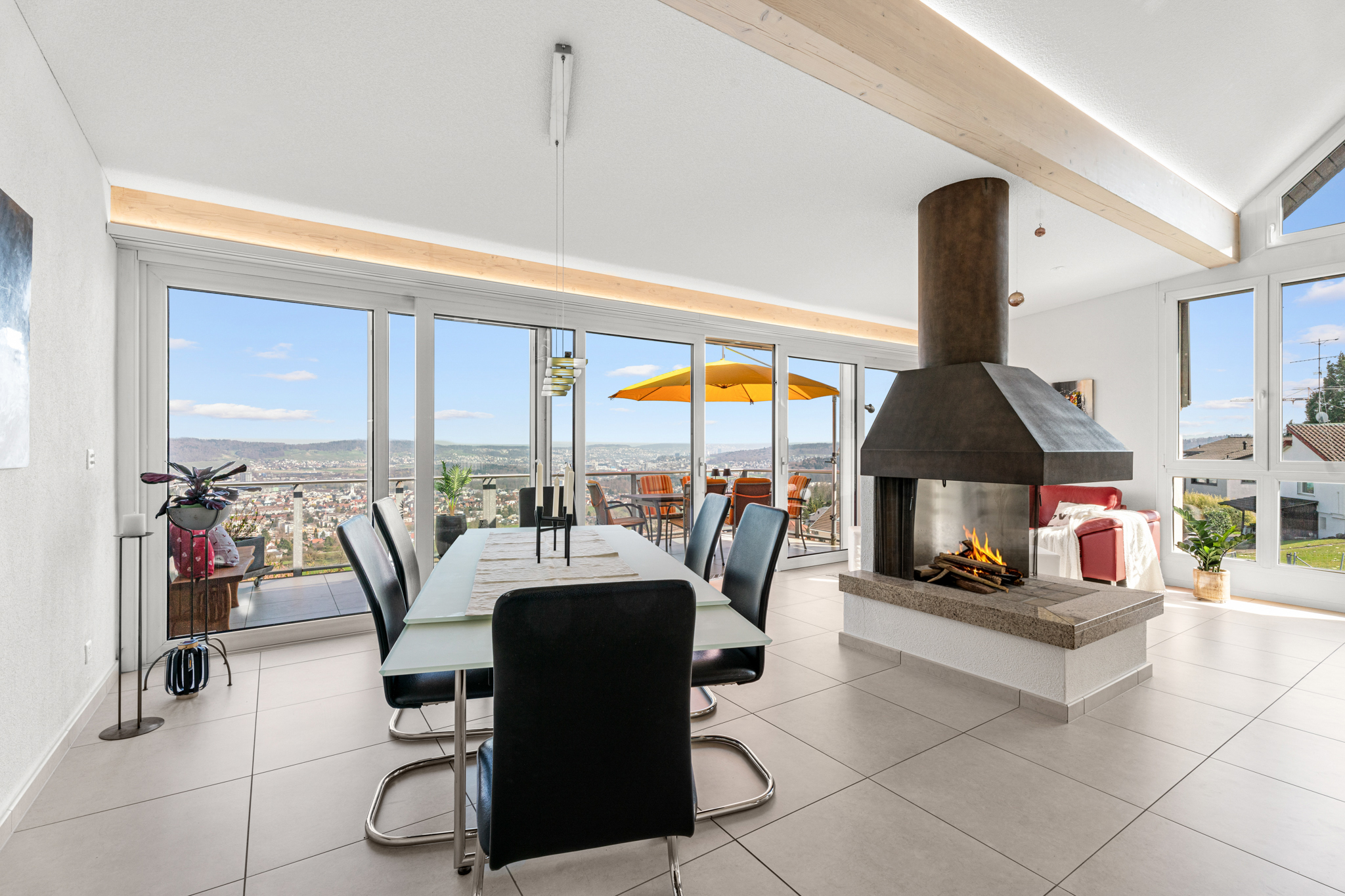 Im Erdgeschoss befindet sich der zentrale Lebensbereich des Hauses, der ganz auf die spektakuläre Aussicht ausgerichtet ist. Wohnen, Essen und Kochen gehen harmonisch ineinander über, während grosse Fensterflächen den Blick weit über das Limmattal schweifen lassen. Das Cheminée setzt einen markanten Akzent und verleiht dem Raum eine besondere Behaglichkeit. Die offene, hochwertig ausgestattete Küche fügt sich stimmig in das Gesamtbild ein.