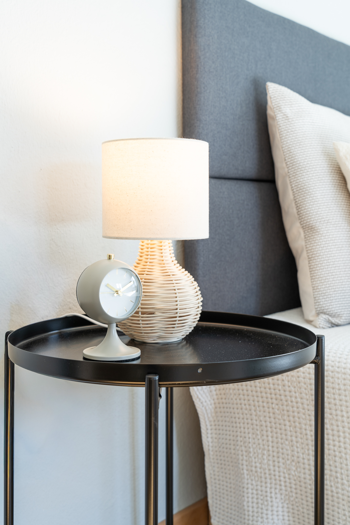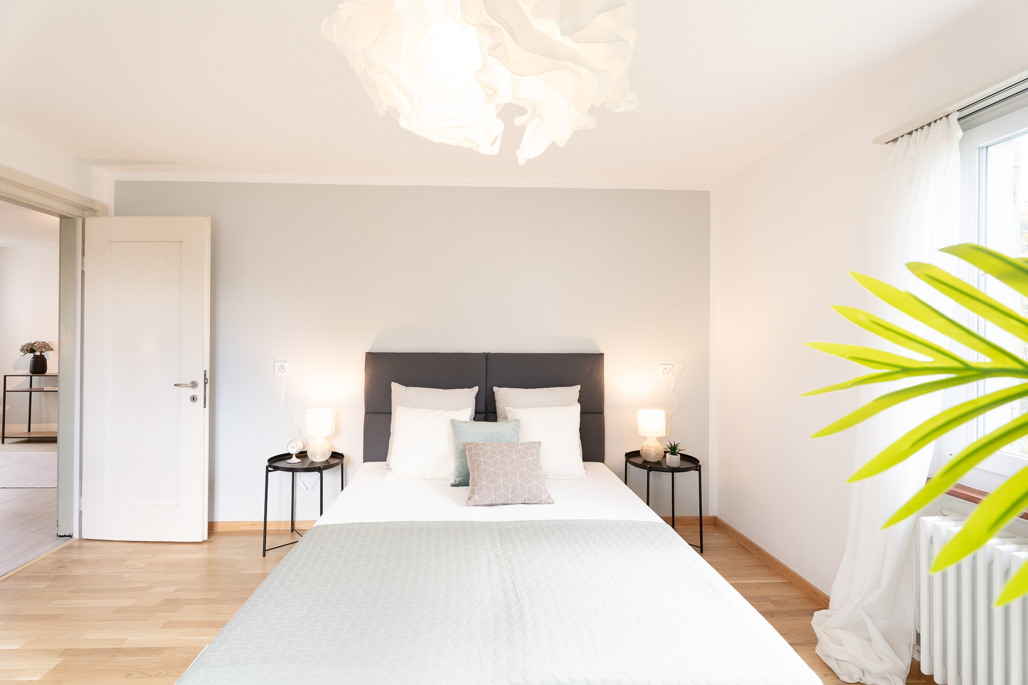 Gegenüber dem Essbereich liegt die Küche, – die ebenso wie das Bad – mit stillvollen portugiesischen Designfliesen Akzente setzt. Das geräumige Elternschlafzimmer ist zum Garten hin ausgerichtet und bietet eine ruhige Rückzugsmöglichkeit. Ein weiteres Zimmer beim Eingang eignet sich ideal als Kinder-, Arbeits- oder Gästezimmer. Das Familienbad mit Badewanne überzeugt durch angenehme Bodenheizung und natürliches Tageslicht. Abgerundet wird der Grundriss durch eine praktische Gästetoilette.