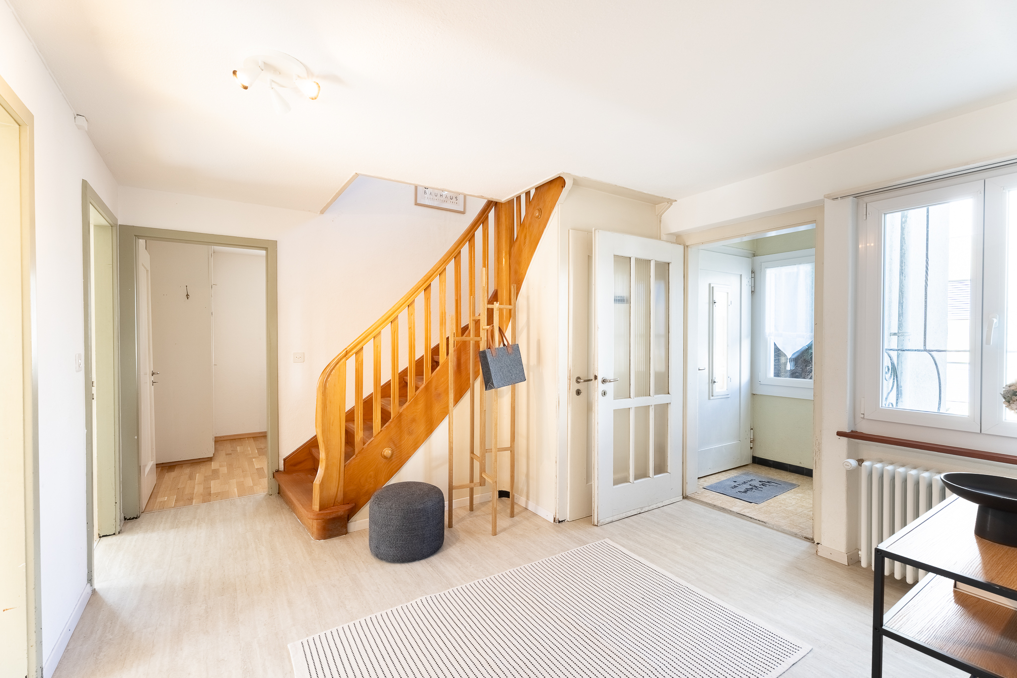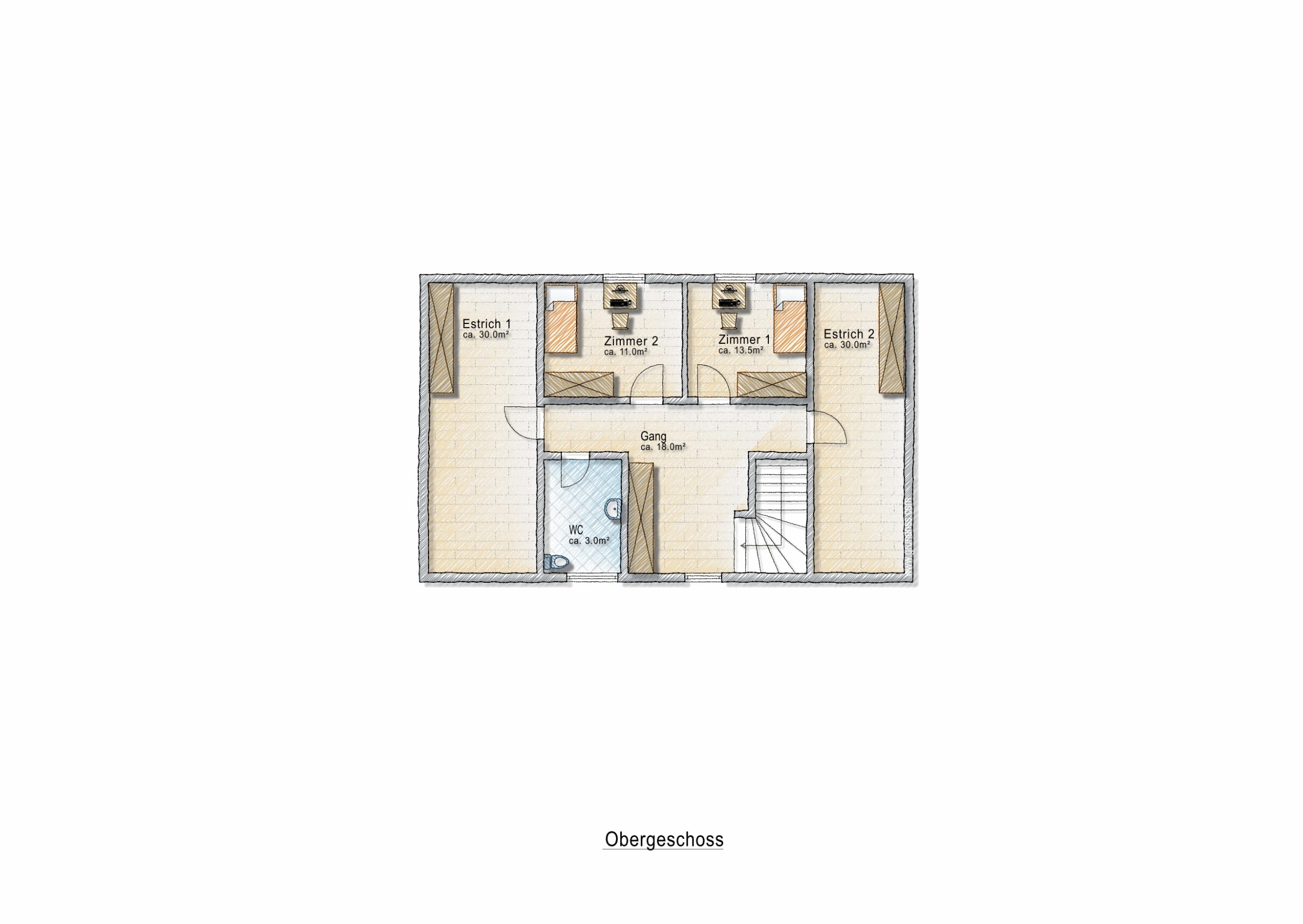 Eine schöne, geschwungene Holztreppe führt ins Obergeschoss, in dem zwei weitere, gut geschnittene Schlafzimmer mit Böden aus edlem Kirschbaumholz, sowie eine Toilette angeordnet sind. Zwei Estriche à je 30 m2 bieten fantastische Ausbaumöglichkeiten.