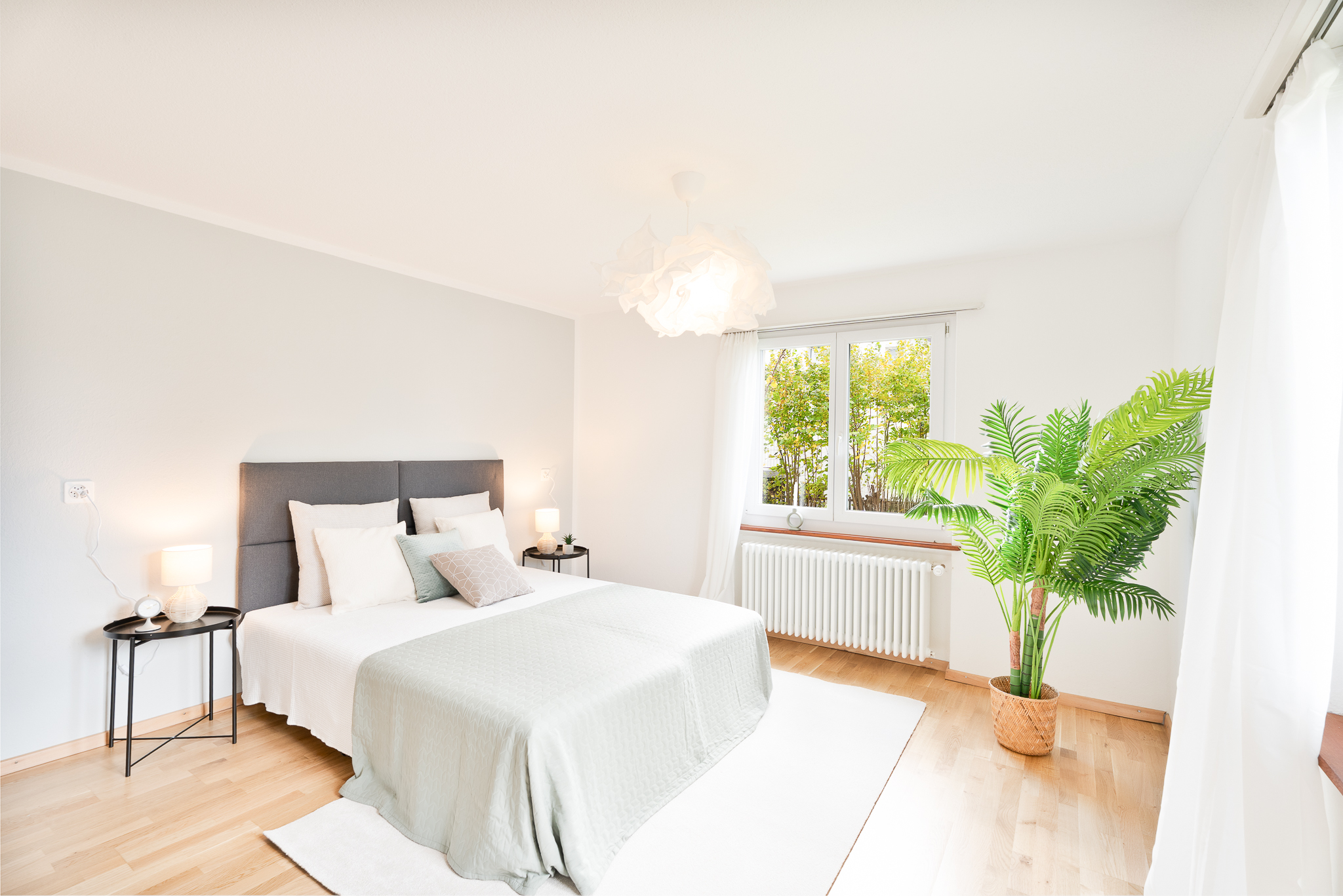 - Eichenparkettboden (Wohnzimmer, Schlafzimmer)