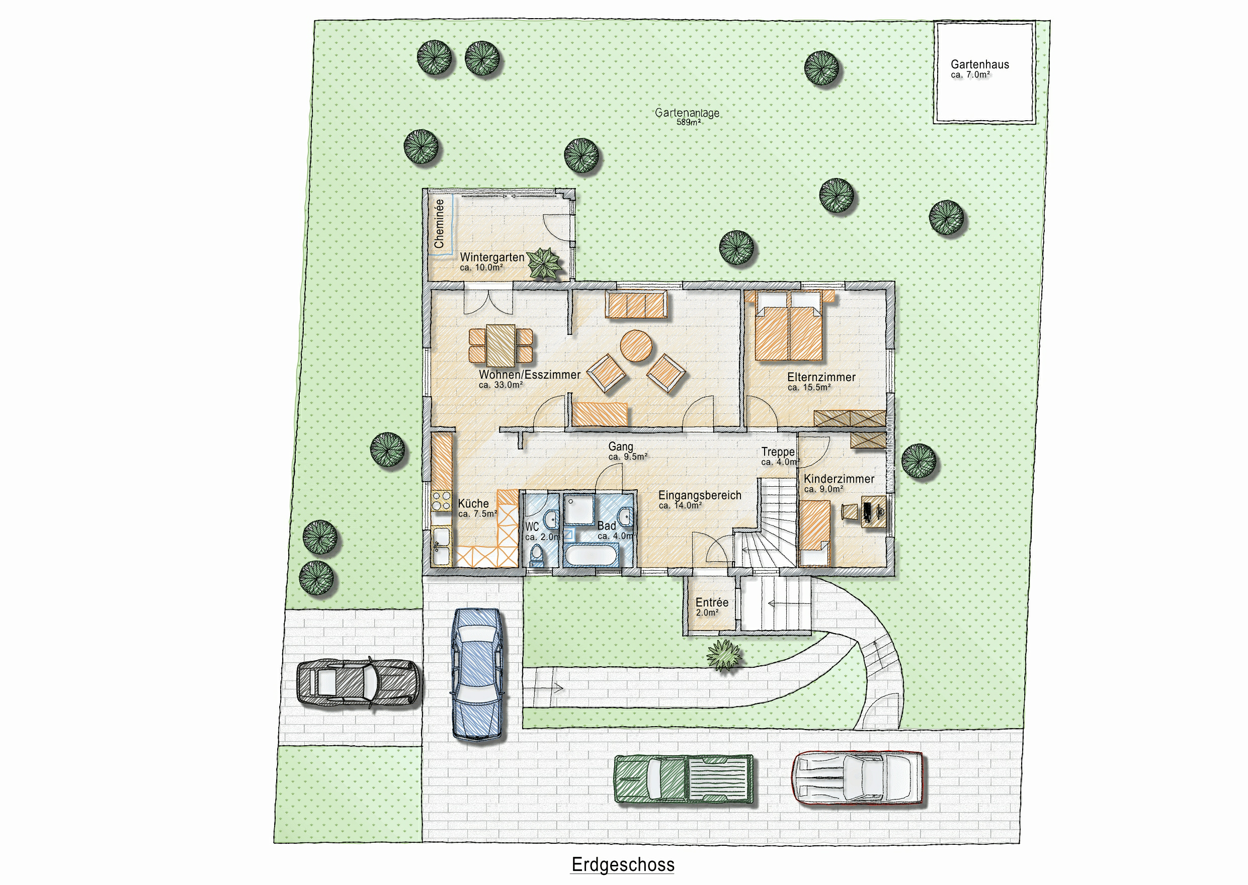 Ihre Autos können Sie auf den drei Aussenparkplätzen oder in der integrierten Garage abstellen. Im Erdgeschoss entfaltet sich ein heller Wohn- und Essbereich mit angrenzendem Wintergarten als stilvoller Mittelpunkt des Hauses mit Zugang zum Garten. Ein Cheminée sorgt für eine behagliche Wohnatmosphäre, grosszügige Fenster schaffen eine harmonische Verbindung zur Natur, und eine elektrische Sitzbank verleiht dem Wohnzimmer zusätzlichen Komfort.