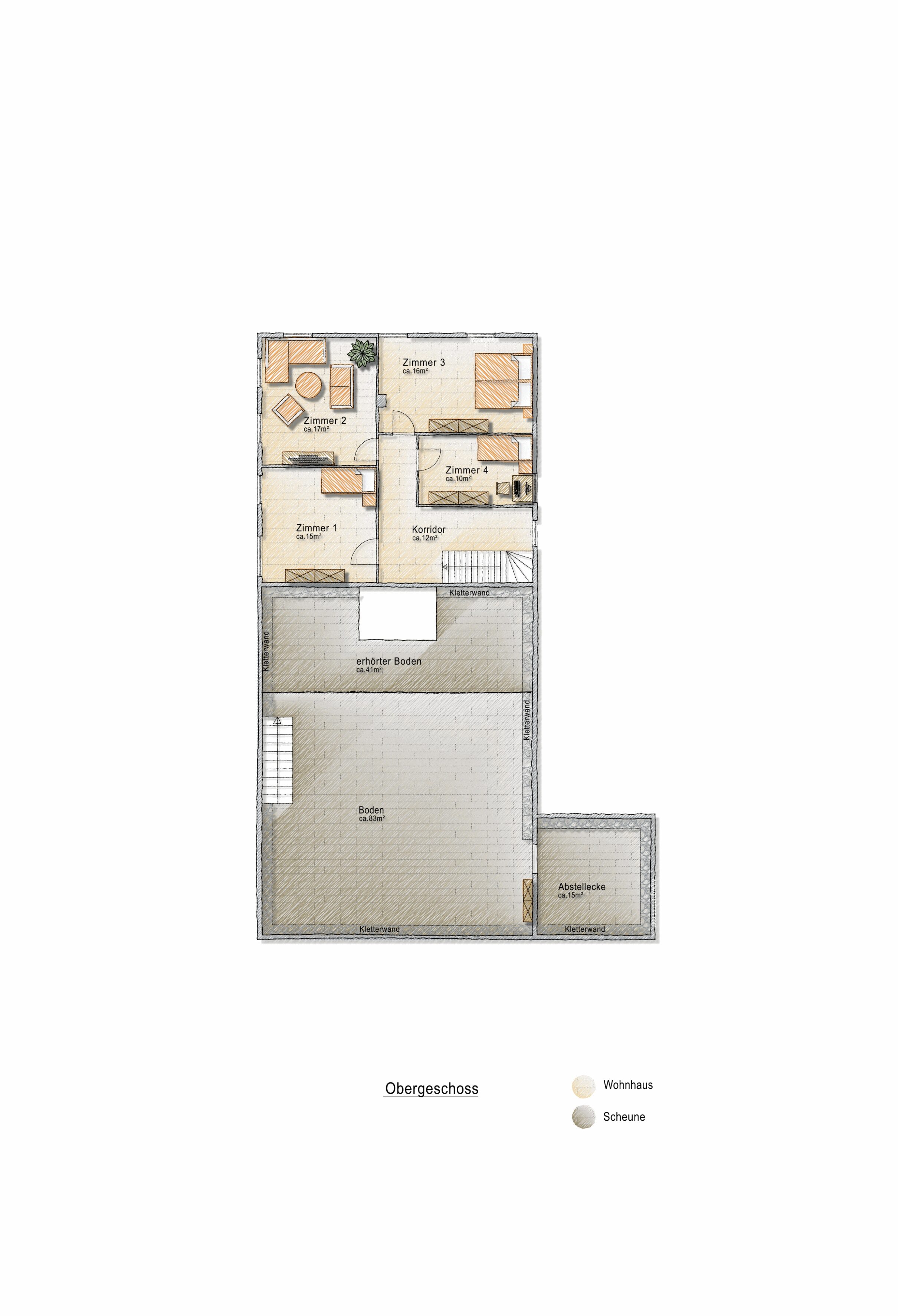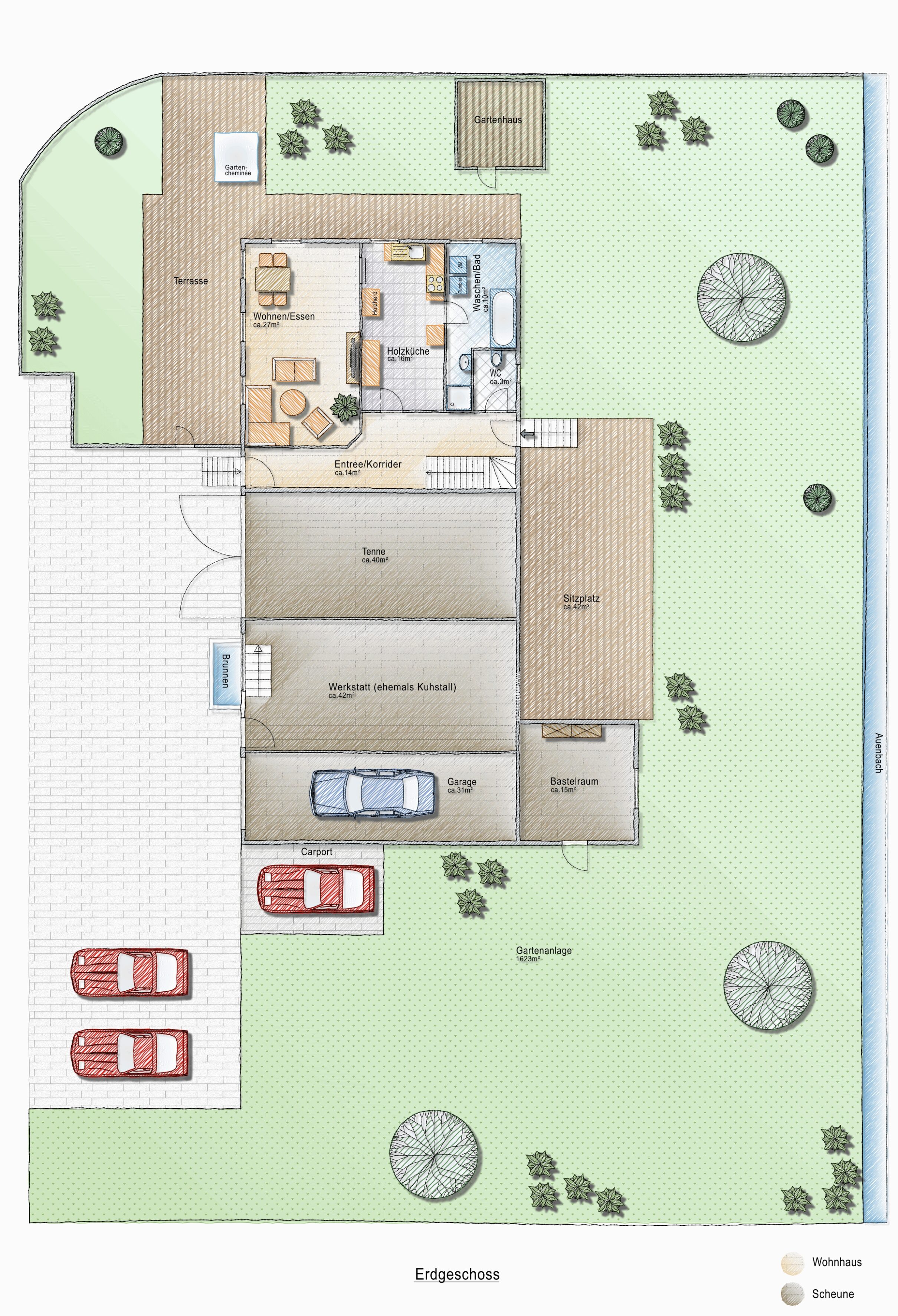 Die angrenzende Scheune bietet mit ihren diversen Räumlichkeiten viel Freiraum für grosse Ideen und kreative Projekte. Ebenfalls verfügt die Scheune über eine integrierte Kletterwand, die sportliche Möglichkeiten eröffnet und das Objekt zusätzlich aufwertet. Mehr Details dazu finden Sie im Grundriss auf den Seiten 6, 7 und 8.