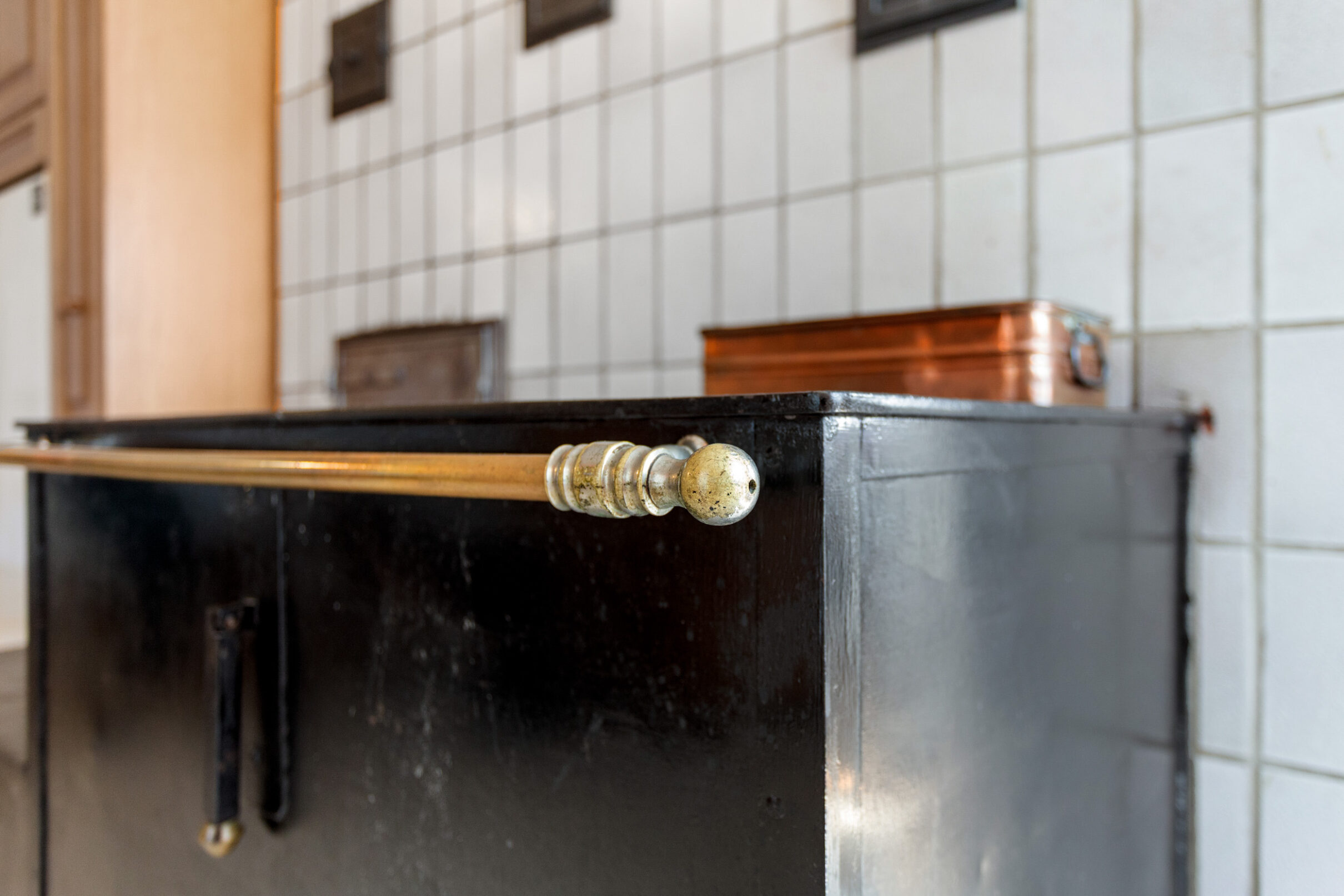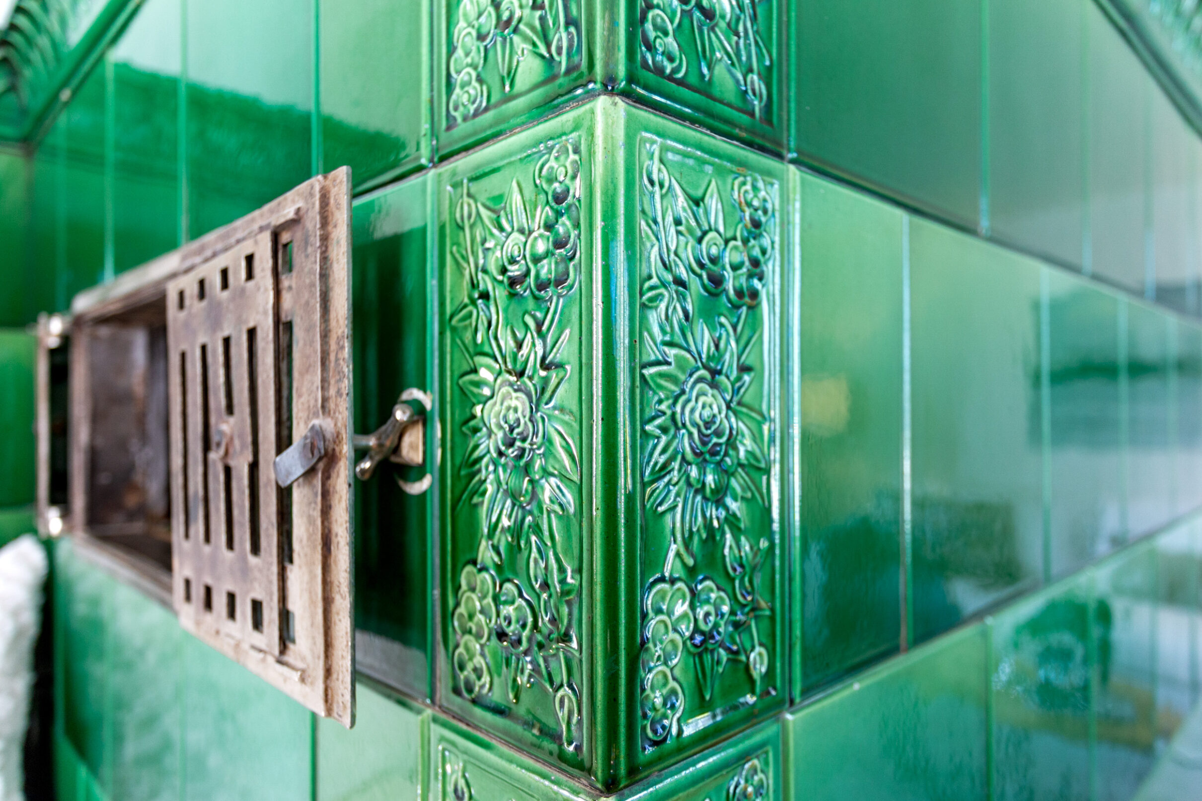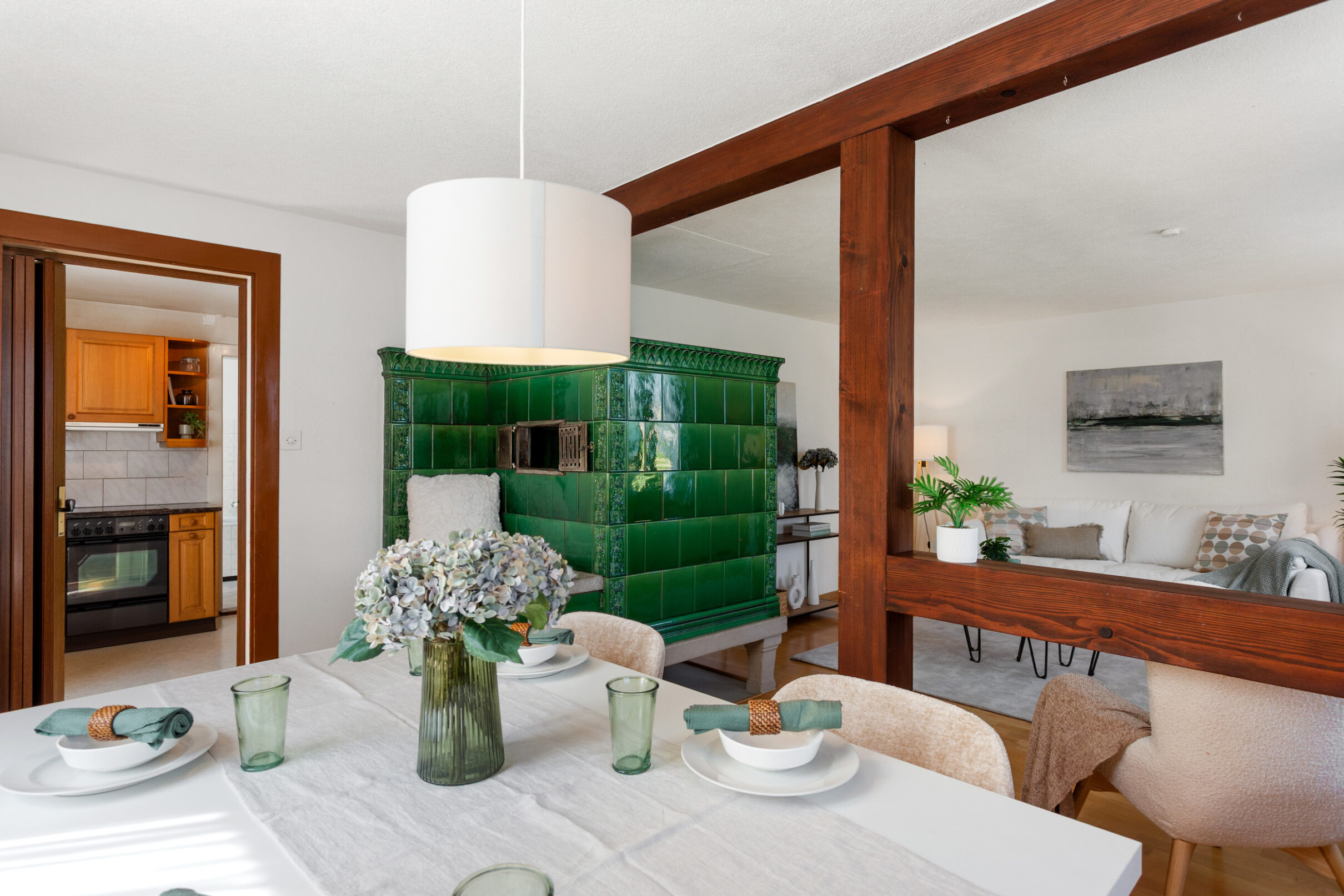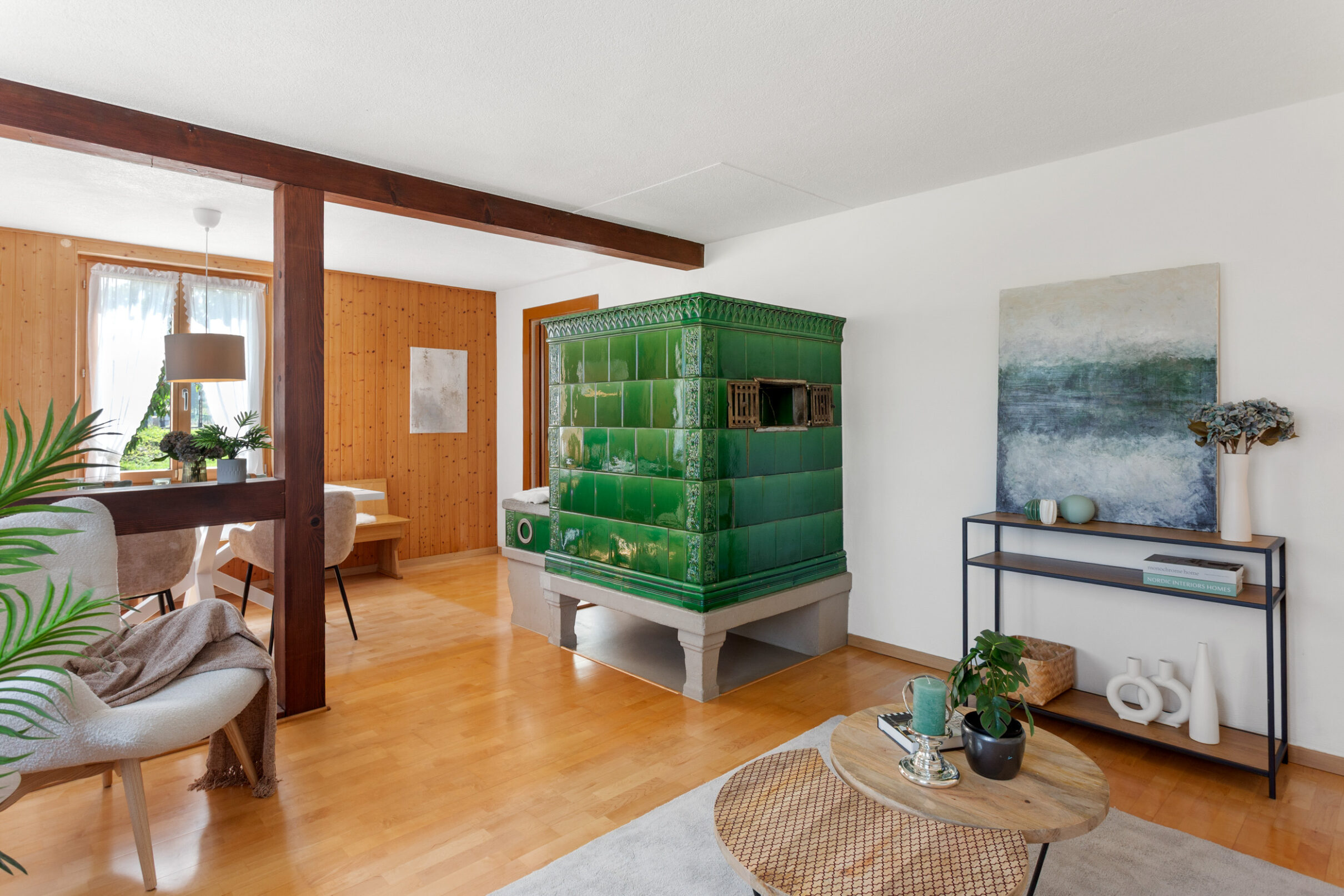 Der offene Wohn- und Essbereich ist mit sehr viel Holz gestaltet, besonders auffällig dabei ist der grosse, grüne Kachelofen, der zum charakteristischen Mittelpunkt wird.