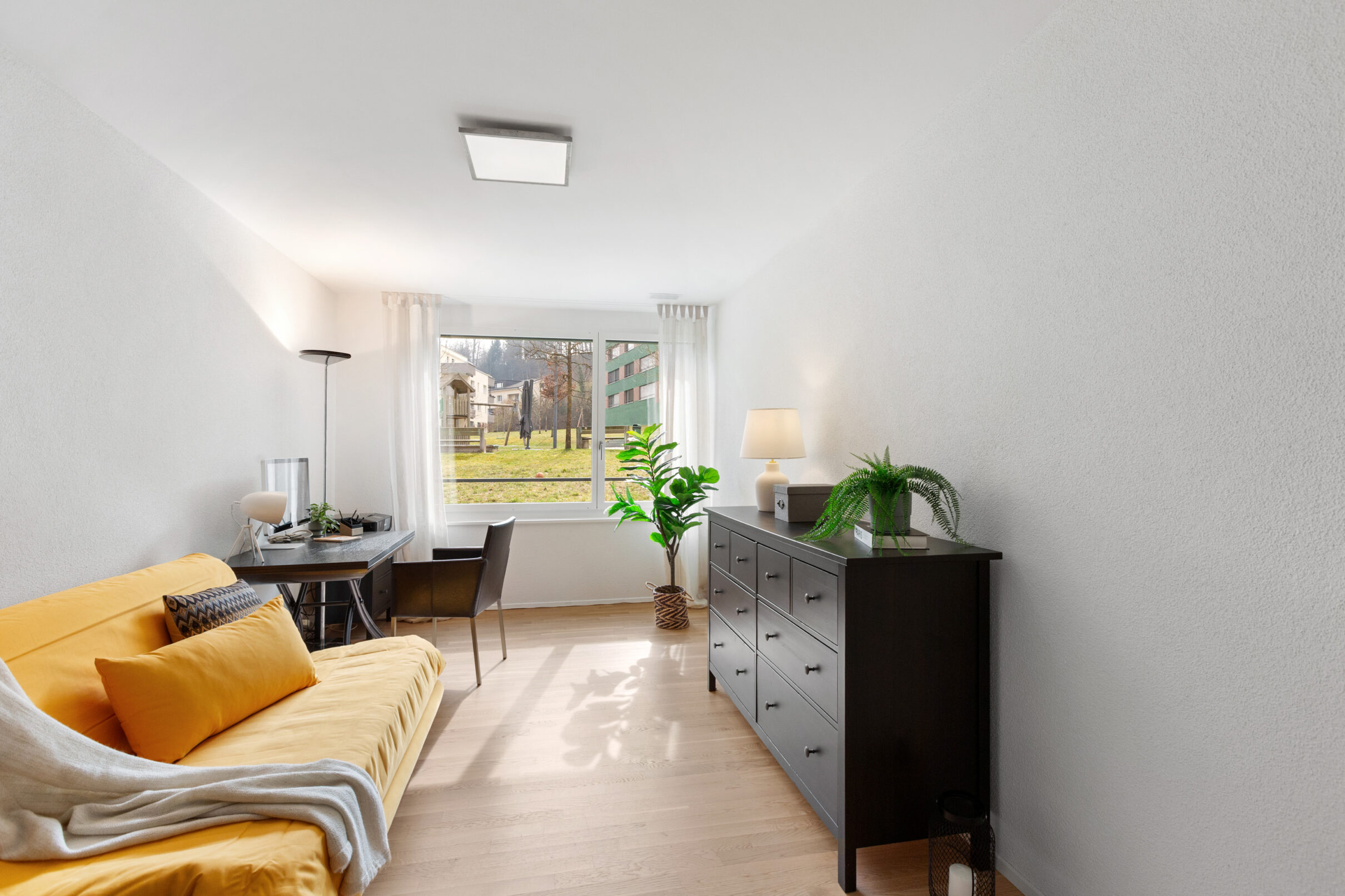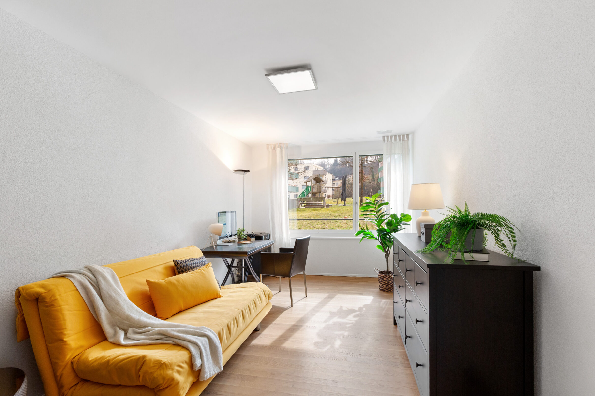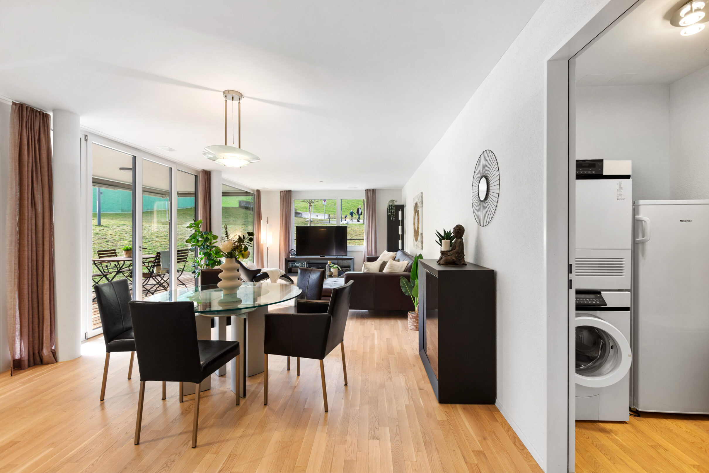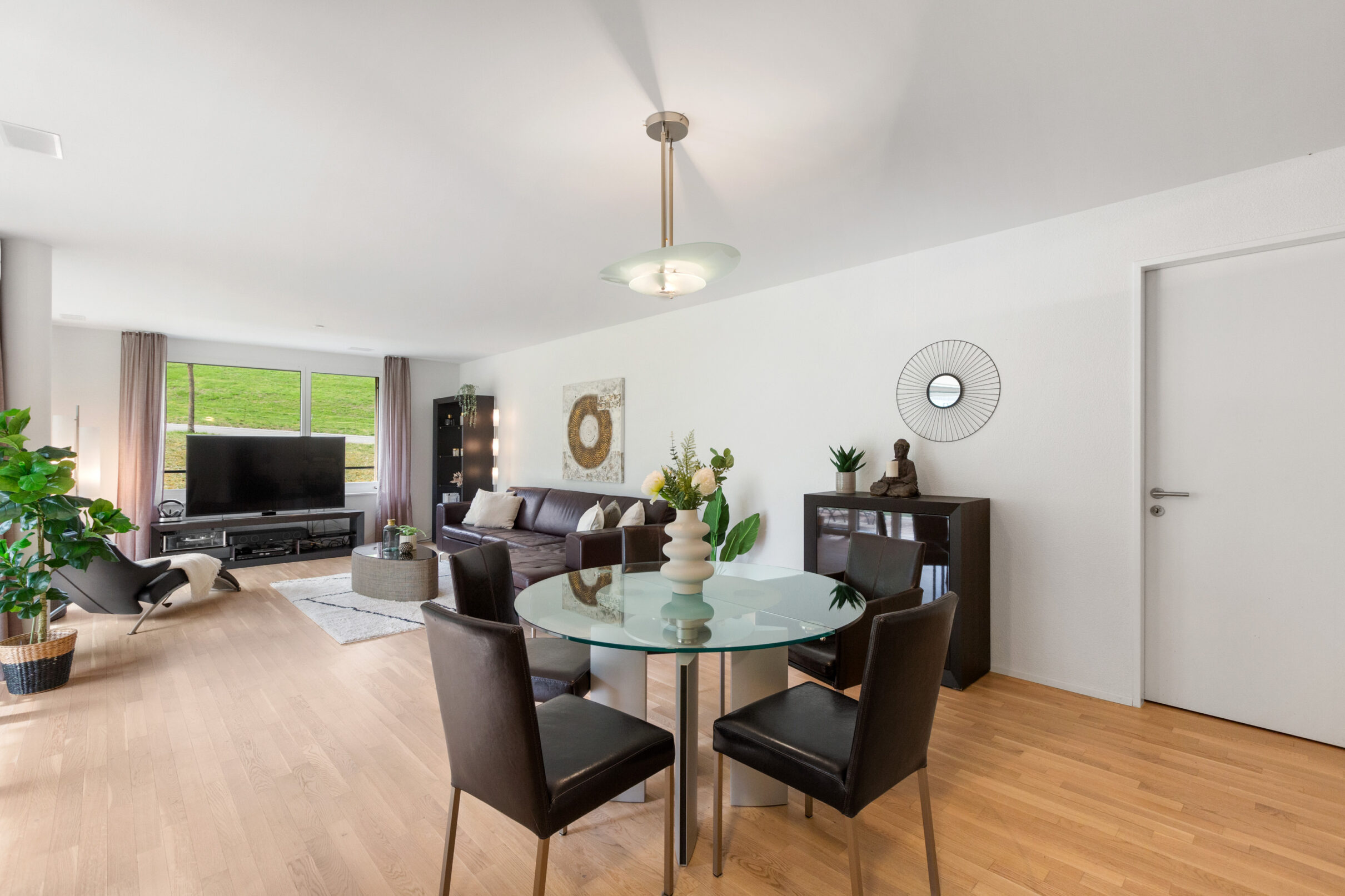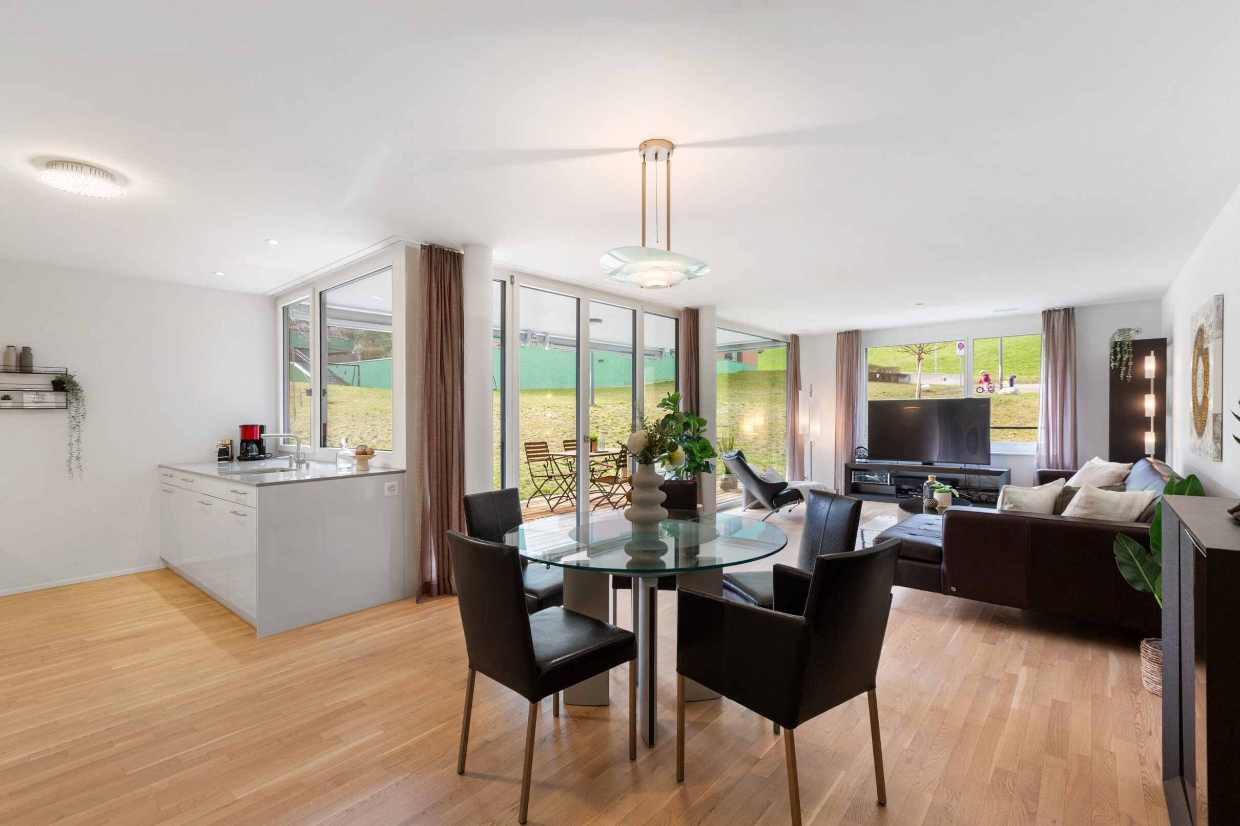 Auf rund 103 m2 Wohnfläche entfaltet sich ein grosszügiges Raumkonzept, das Wohn- und Rückzugsbereiche klar voneinander trennt. Der Wohn- und Essbereich bildet den zentralen Lebensraum der Wohnung und überzeugt durch seine offene Raumstruktur. Breite Fensterflächen lassen viel Tageslicht in den Raum und schaffen eine angenehme Verbindung zur Umgebung. Von hier aus öffnet sich der Wohnraum zum gedeckten Sitzplatz, der den Innenbereich auf natürliche Weise ins Freie erweitert und einen ruhigen Ort für entspannte Stunden im Grünen schafft.