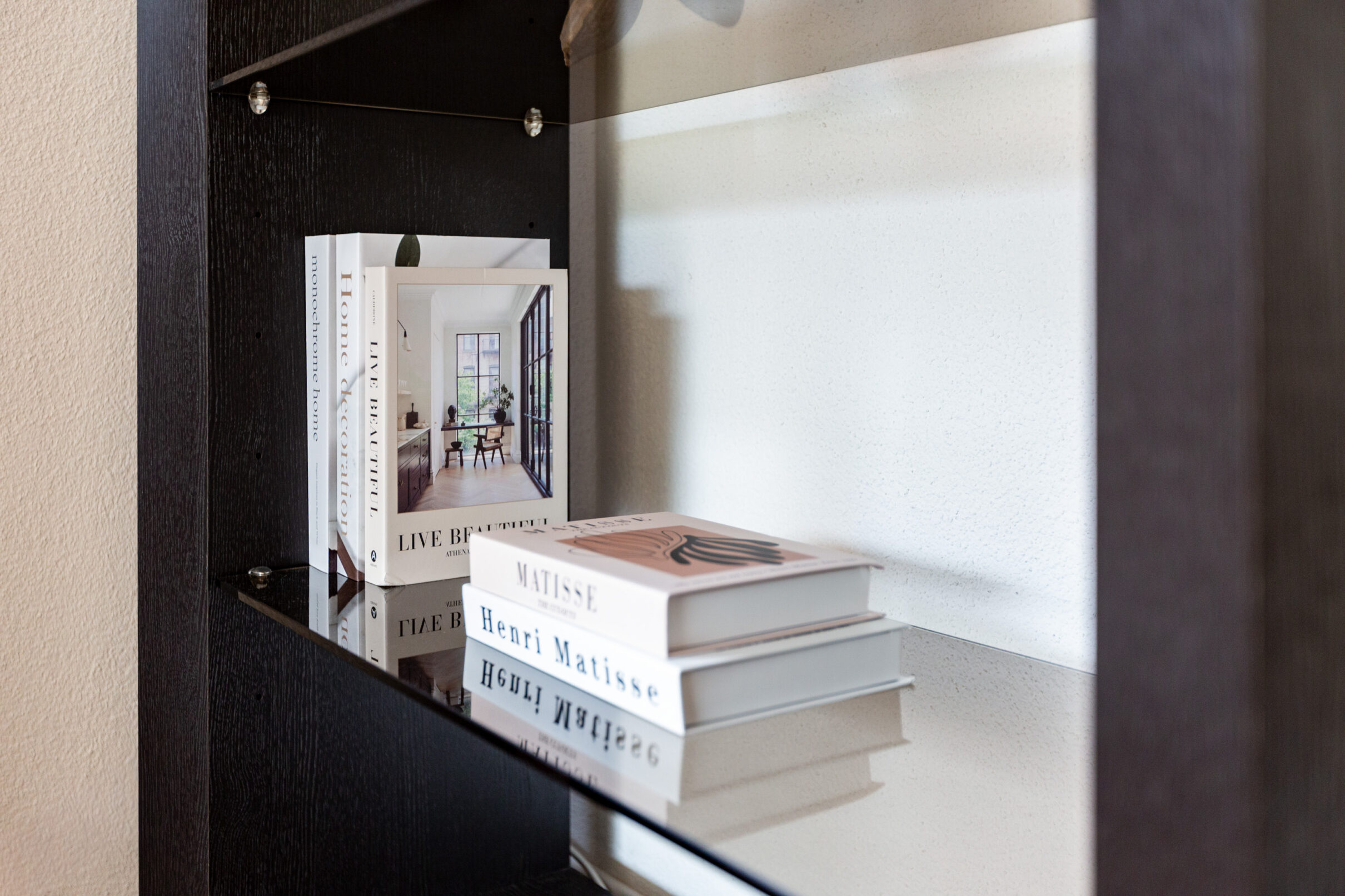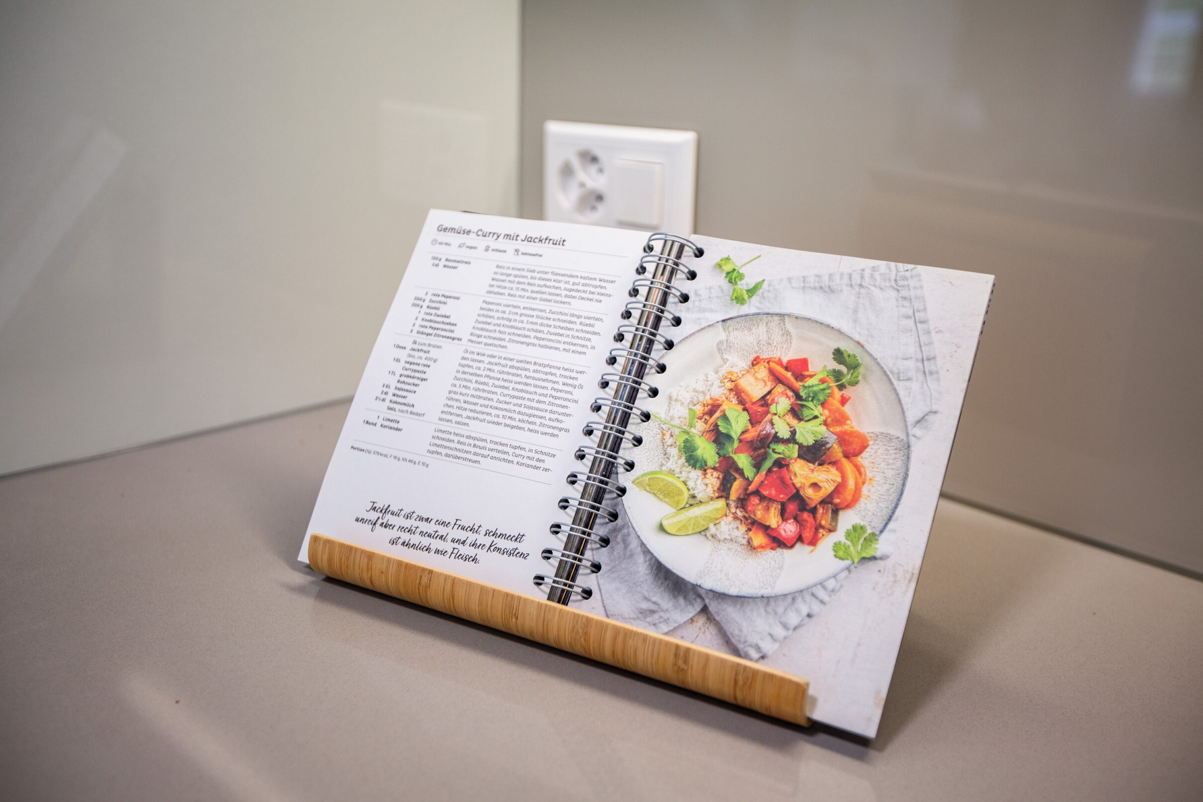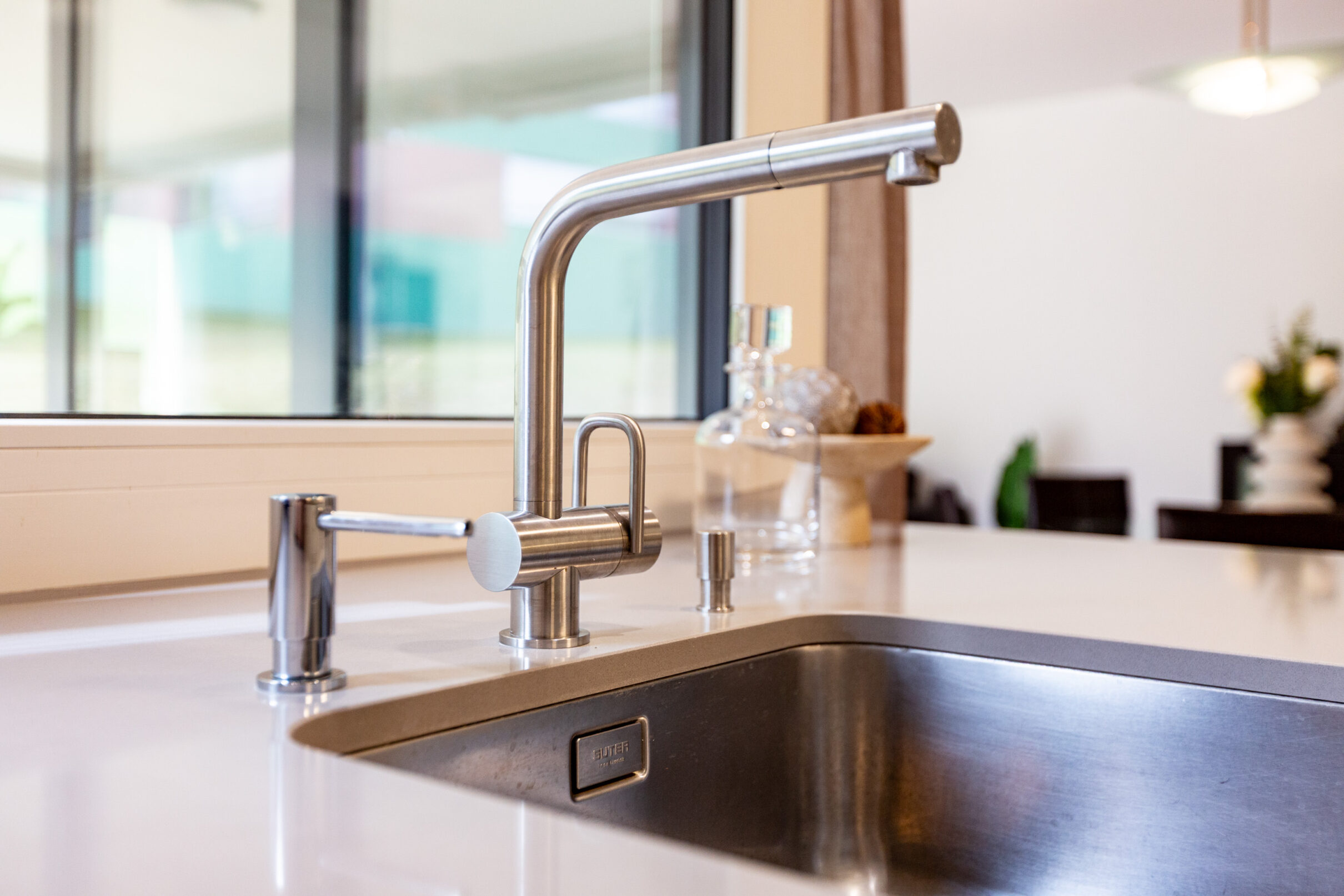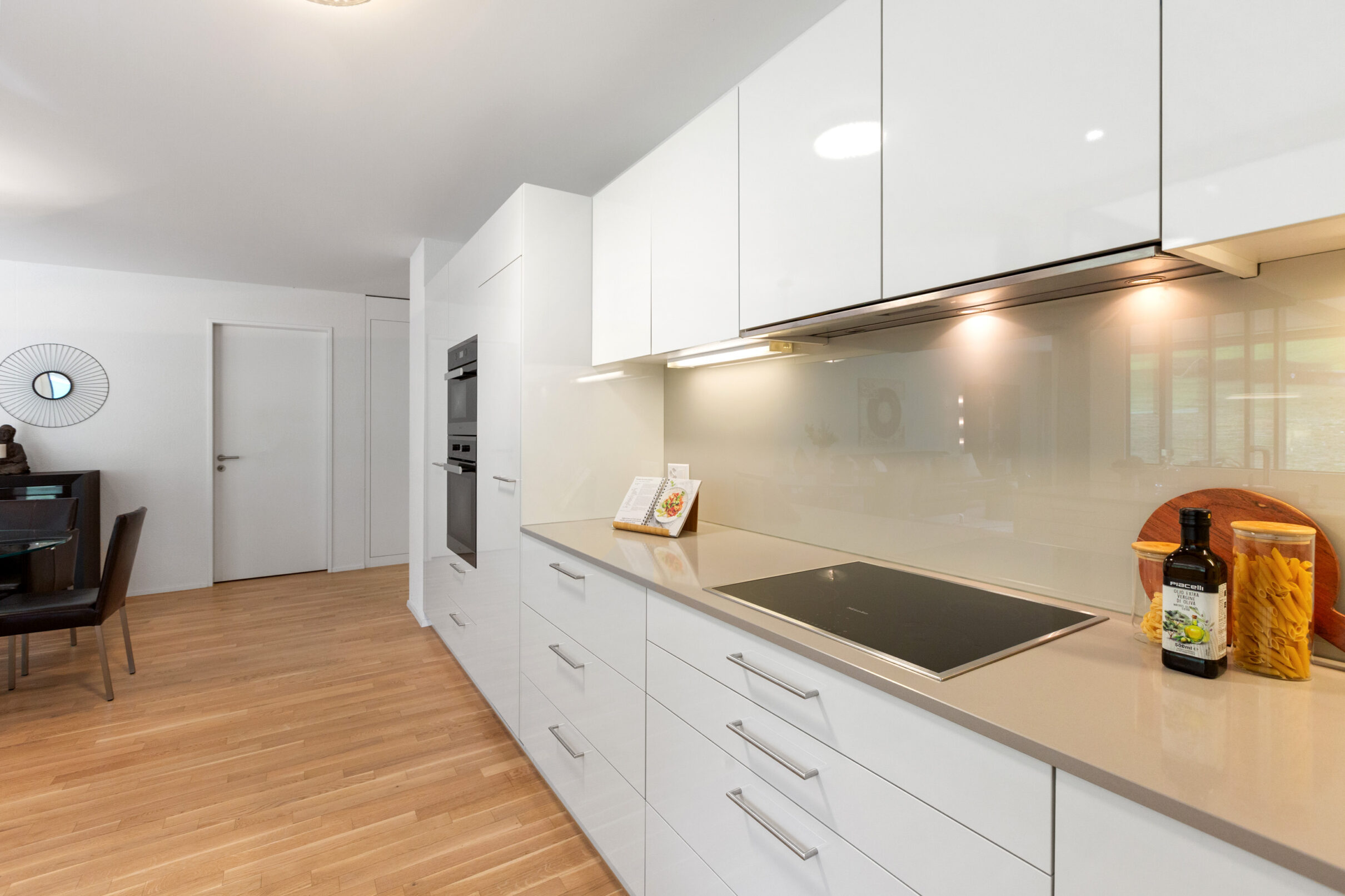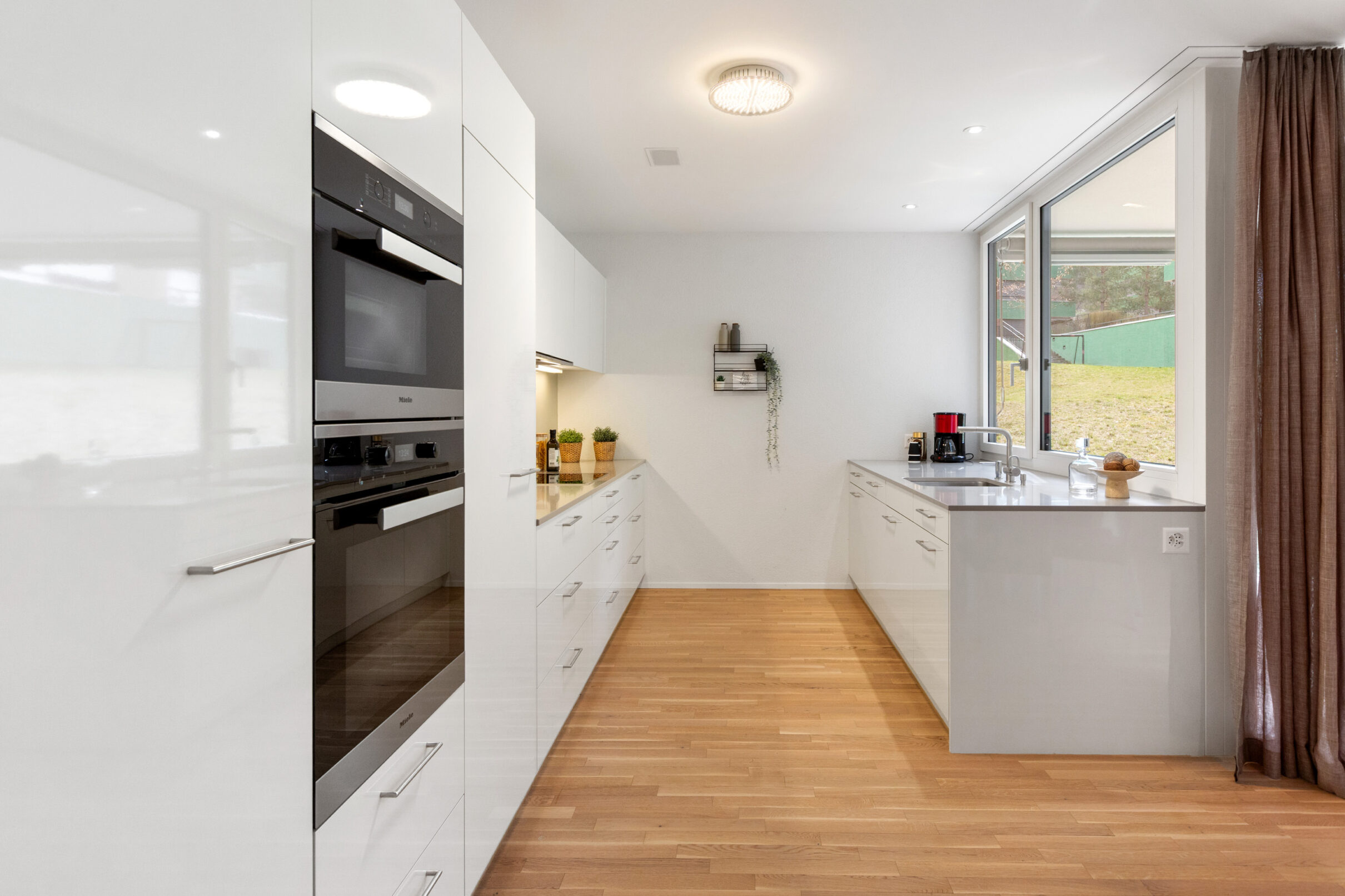 Die moderne Küche ist hochwertig ausgestattet und verbindet Funktionalität mit zeitloser Ästhetik. Sie fügt sich harmonisch ins Raumgefüge ein. Auf Höhe des Essbereichs ist ein praktisches Reduit untergebracht.
