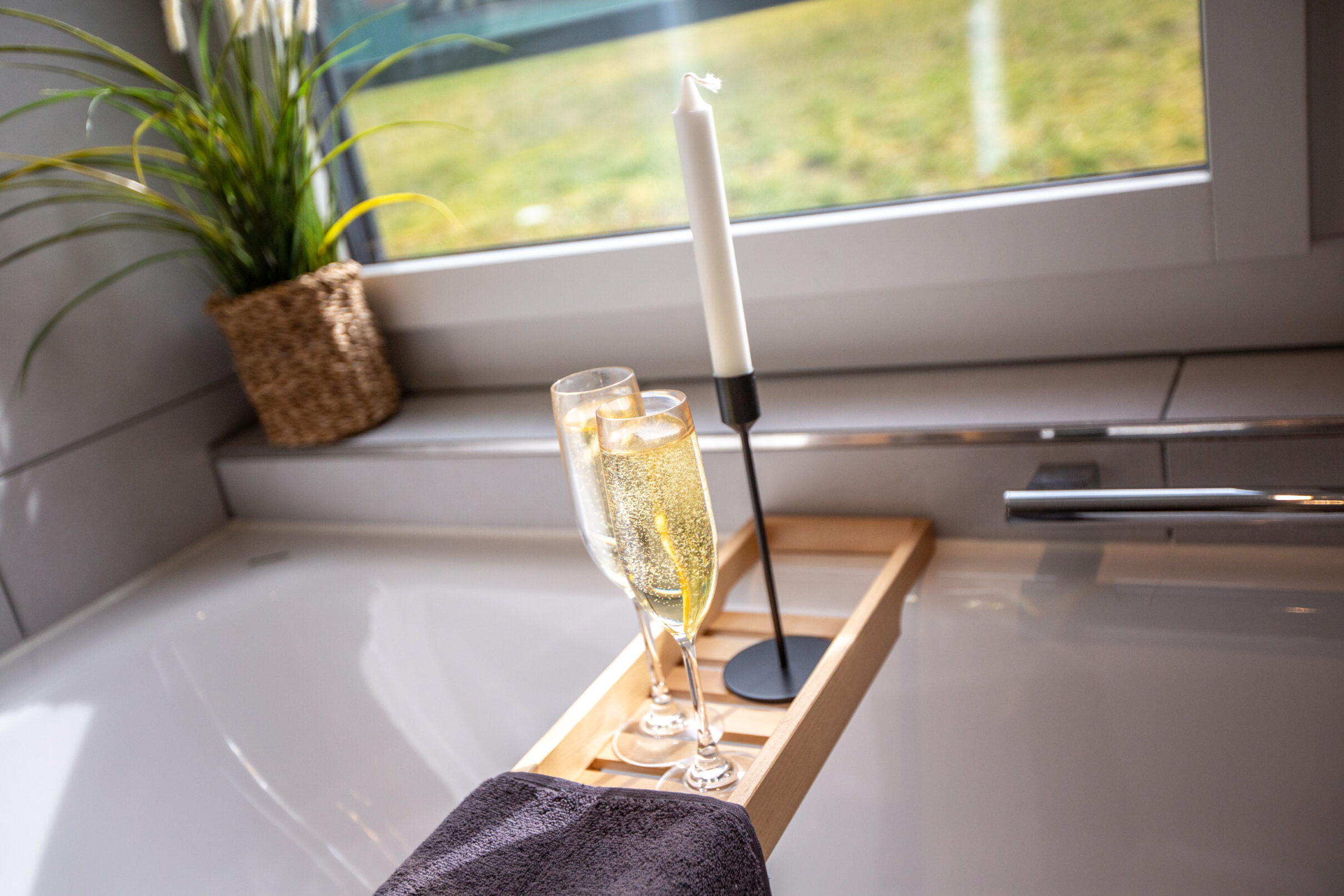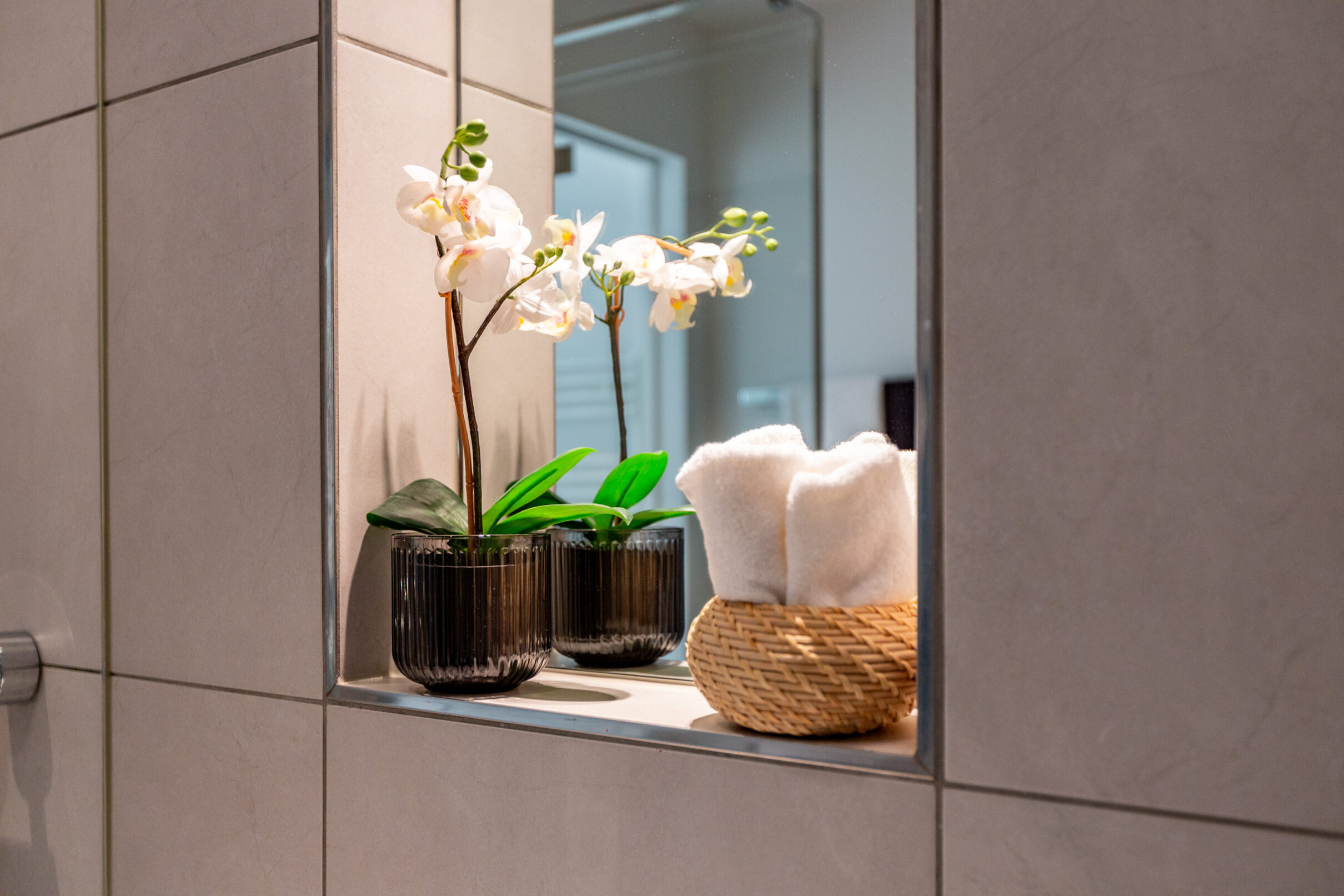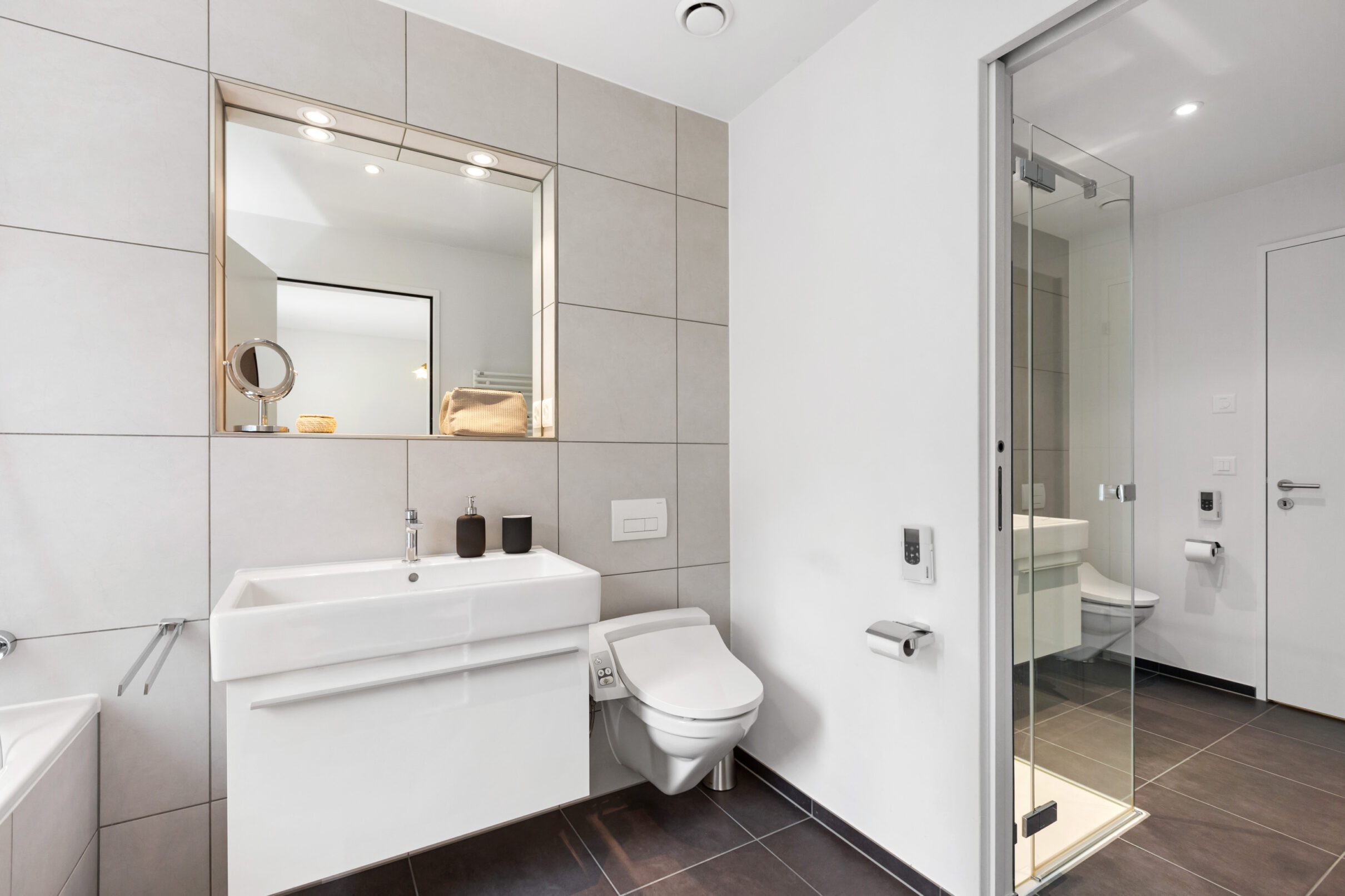 Zwischen den Schlafzimmern sind ein Duschbad und ein Bad mit Badewanne und Tageslicht angeordnet. Die beiden Bäder sind mit Geberit Dusch-WCs ausgestattet und präsentieren sich in einheitlichem Design. Die beiden Nasszellen sind durch eine Schiebetür verbunden und lassen sich bei Bedarf voneinander abtrennen, etwa für zusätzliche Privatsphäre oder als Gäste-WC.