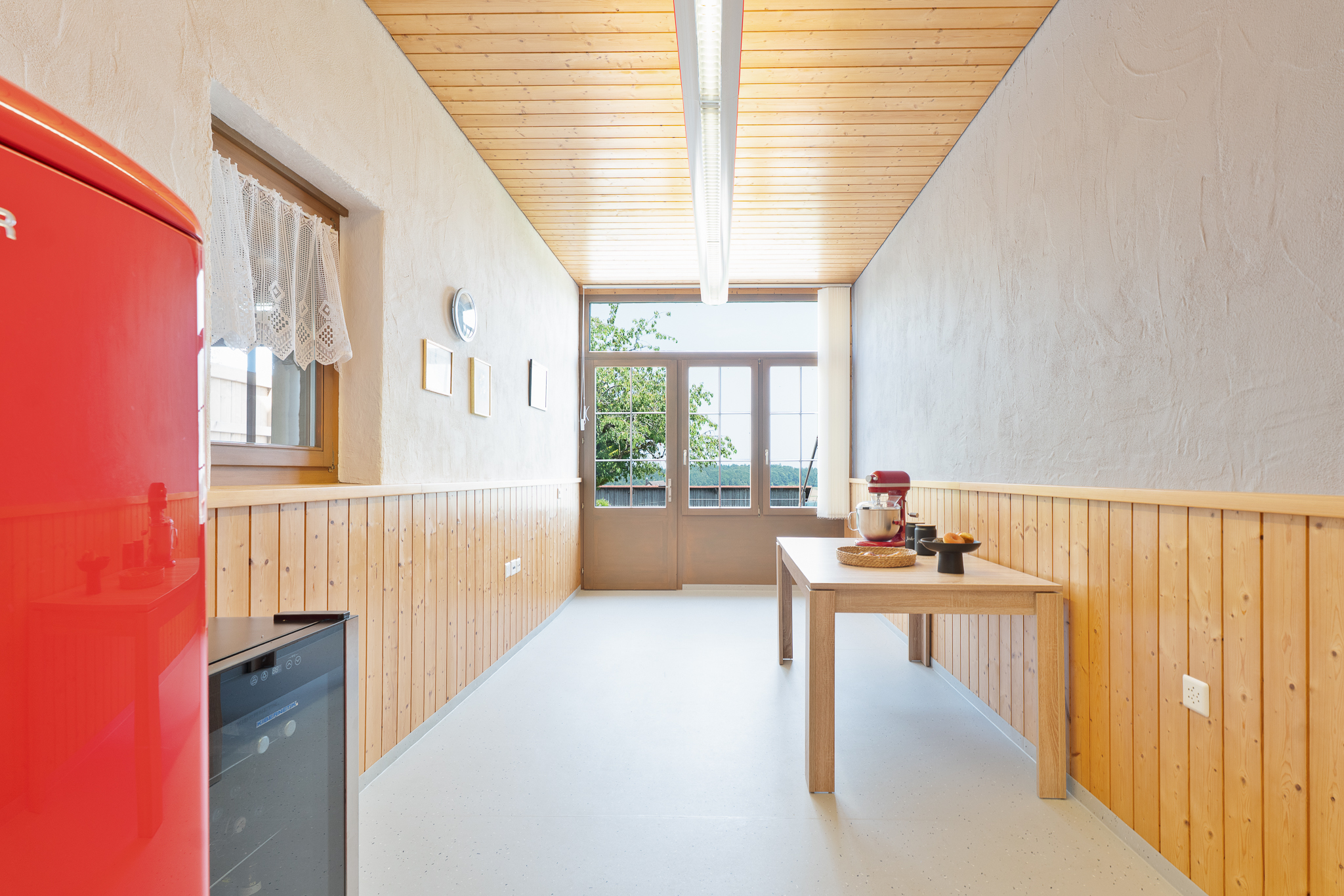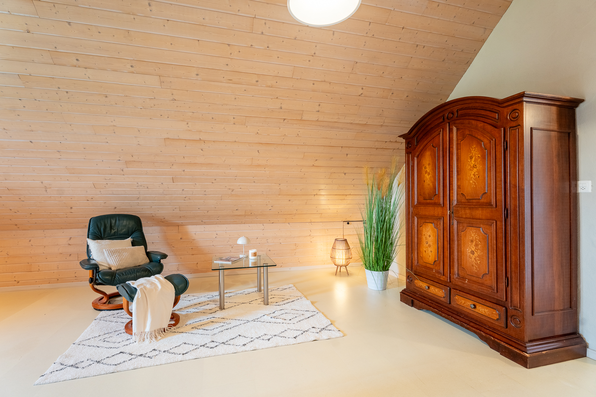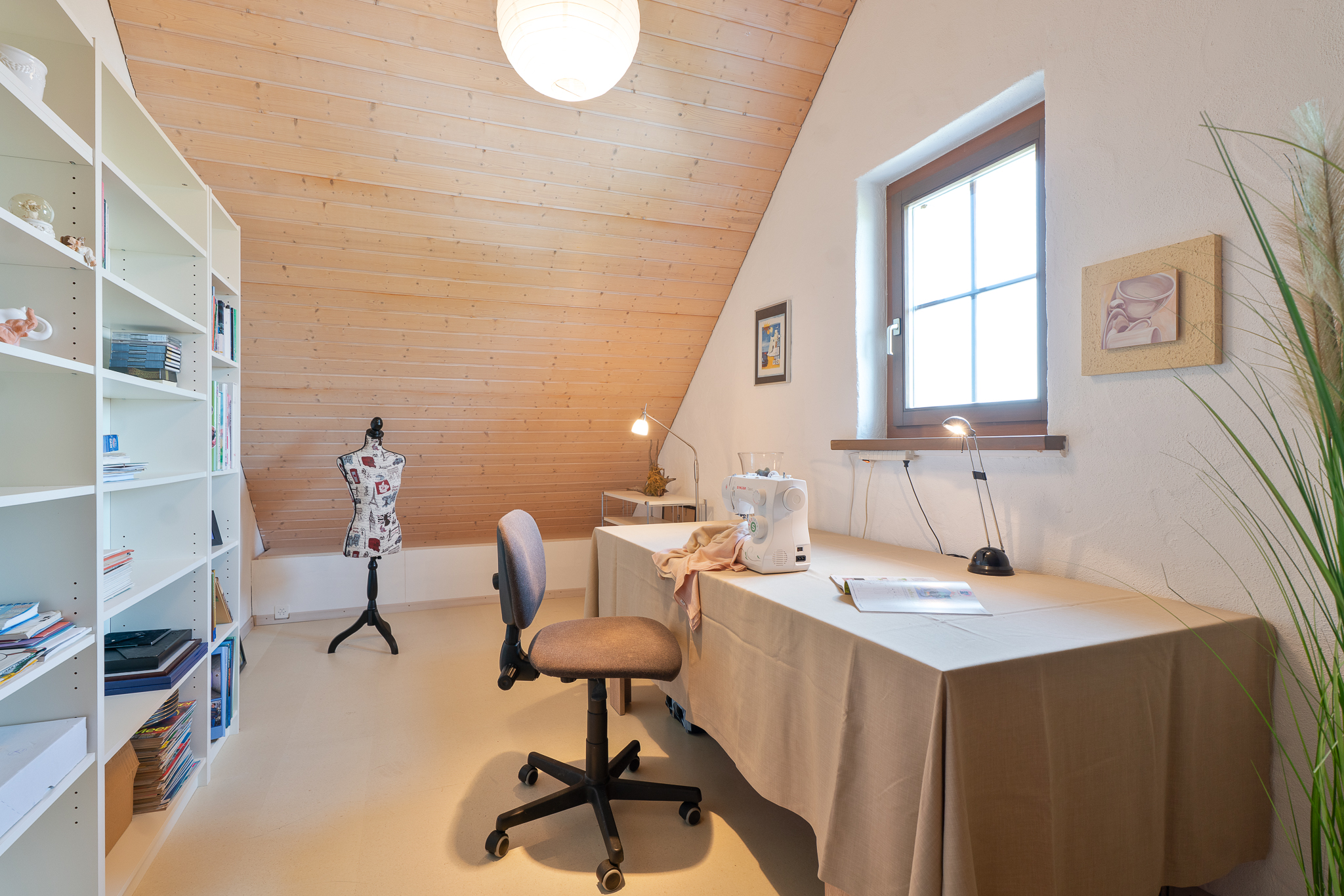 Ein heller Raum erstreckt sich im ausgebauten Dachstock mit seinen charmanten Dachschrägen über die gesamte Wohnfläche. Er ist ideal als Atelier, Hobbyraum oder zusätzlicher Wohnbereich geeignet. Die Installation für eine Bodenheizung und Wasseranschlüsse ist bereits vorbereitet. Das Untergeschoss bietet Ihnen neben Waschküche und Schutzraum-Keller ein Weinlager sowie einen grossflächigen Raum zur flexiblen Nutzung.