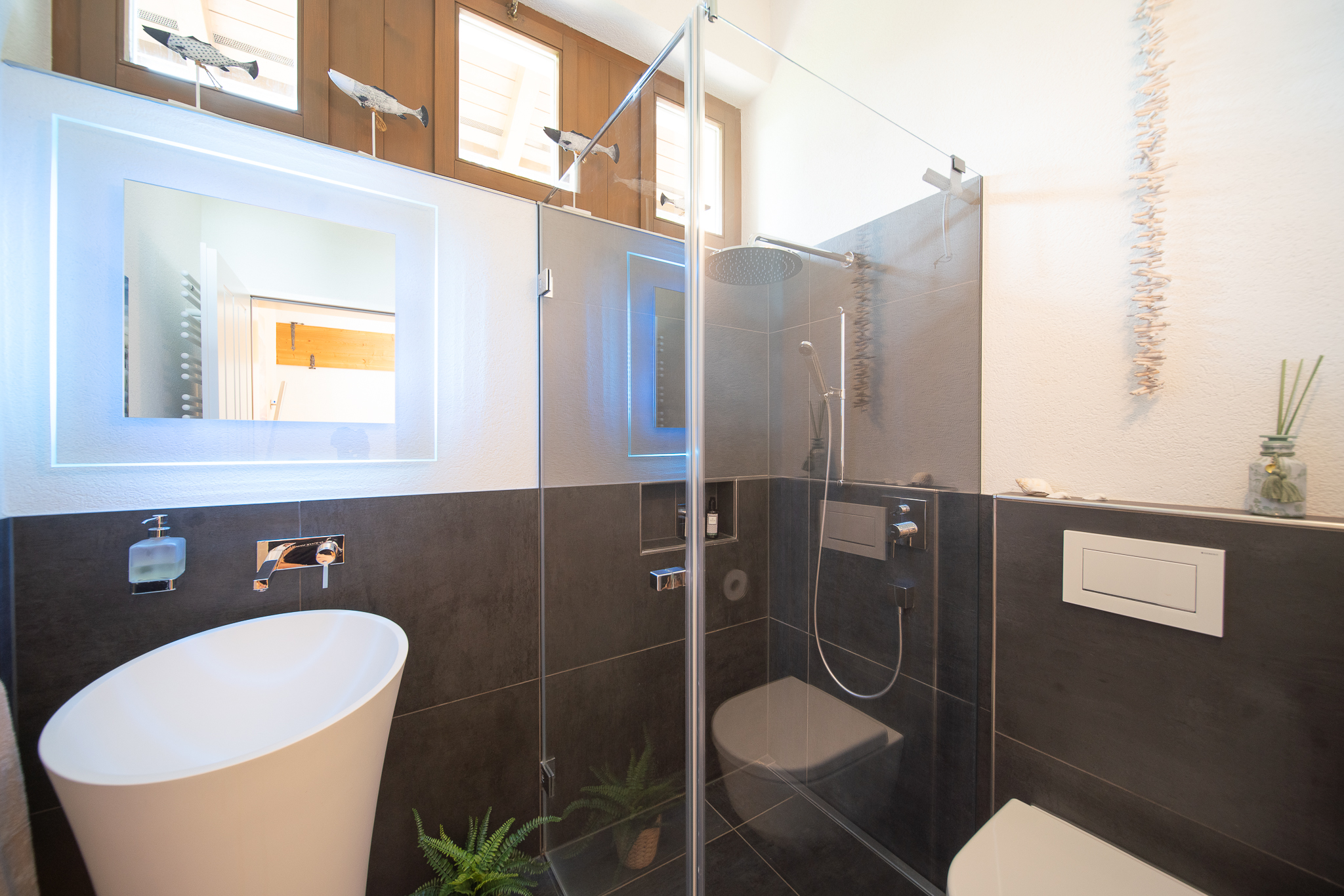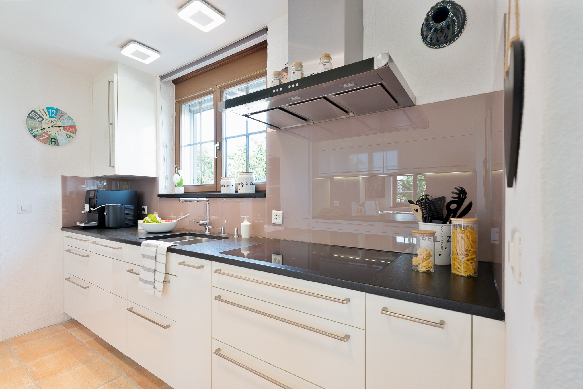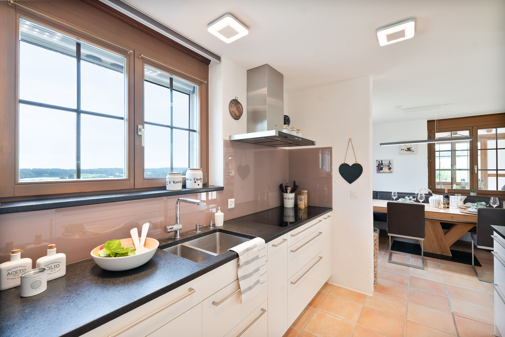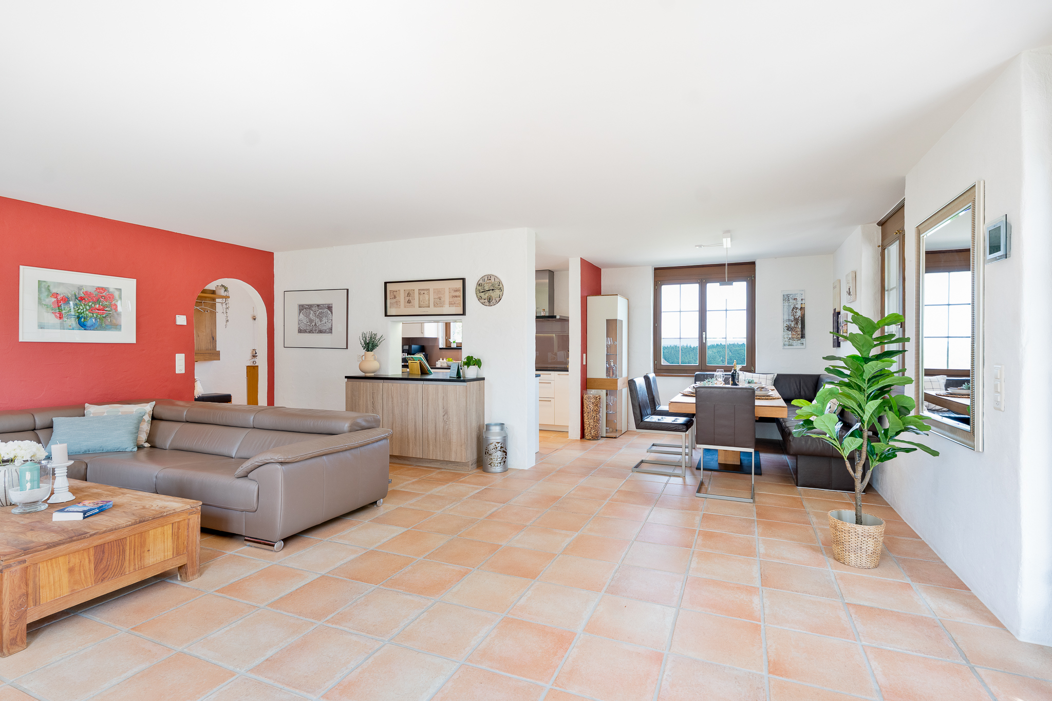Vom einladenden Eingangsbereich aus führen zwei Durchgänge mit Torbogen in die Küche bzw. in den Wohnbereich. Der offen gestaltete Wohn- und Essbereich mit Zugang zum Garten schafft ein angenehmes Raumgefühl. Die halboffene, moderne Küche ist gut ausgestattet, fügt sich harmonisch ins Gesamtbild ein und ermöglicht kurze Wege im Alltag. Ergänzt wird das Erdgeschoss durch einen vielseitig einsetzbaren Mehrzweckraum mit eigenem Aussenzugang sowie einem Badezimmer im Zwischengeschoss.