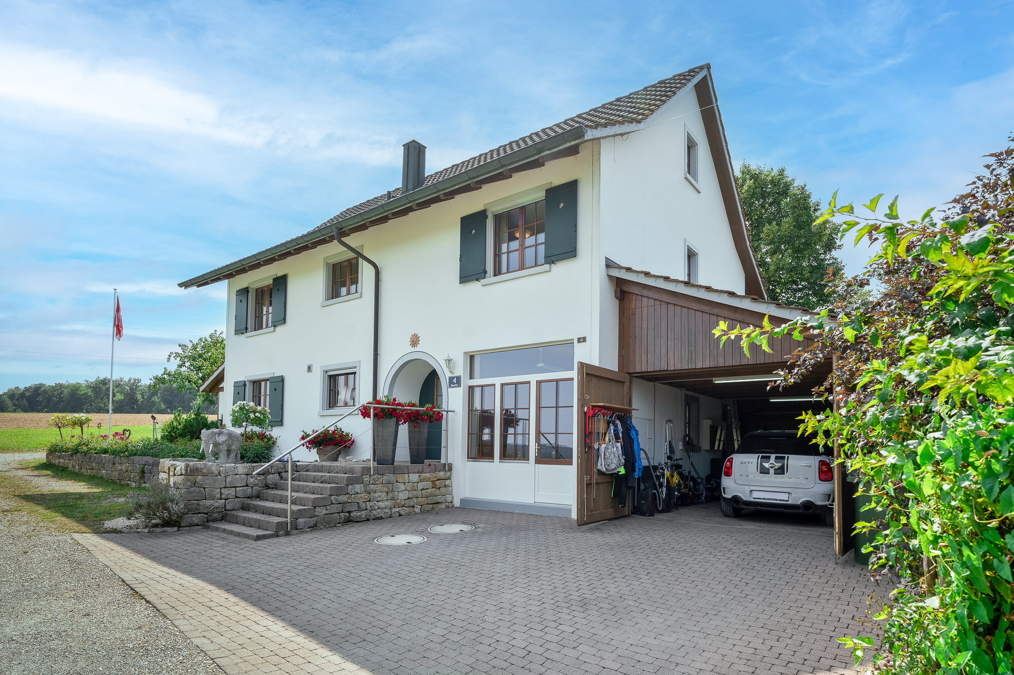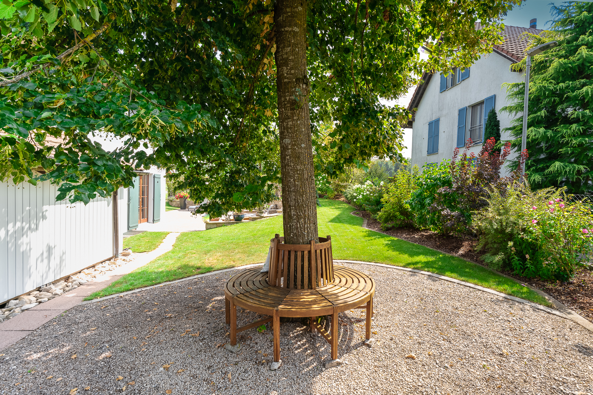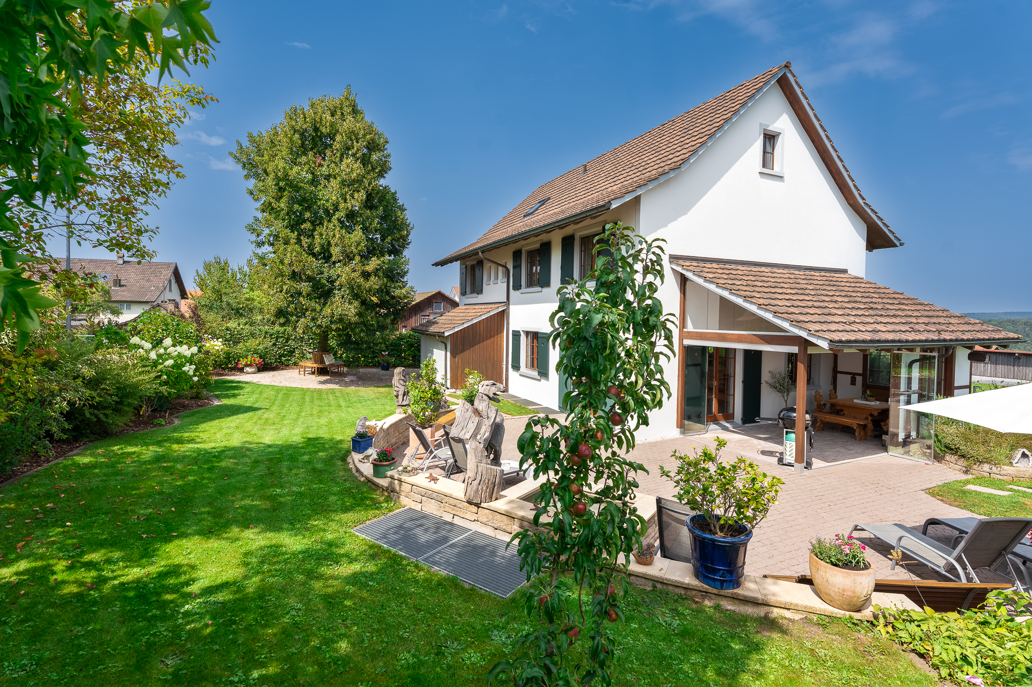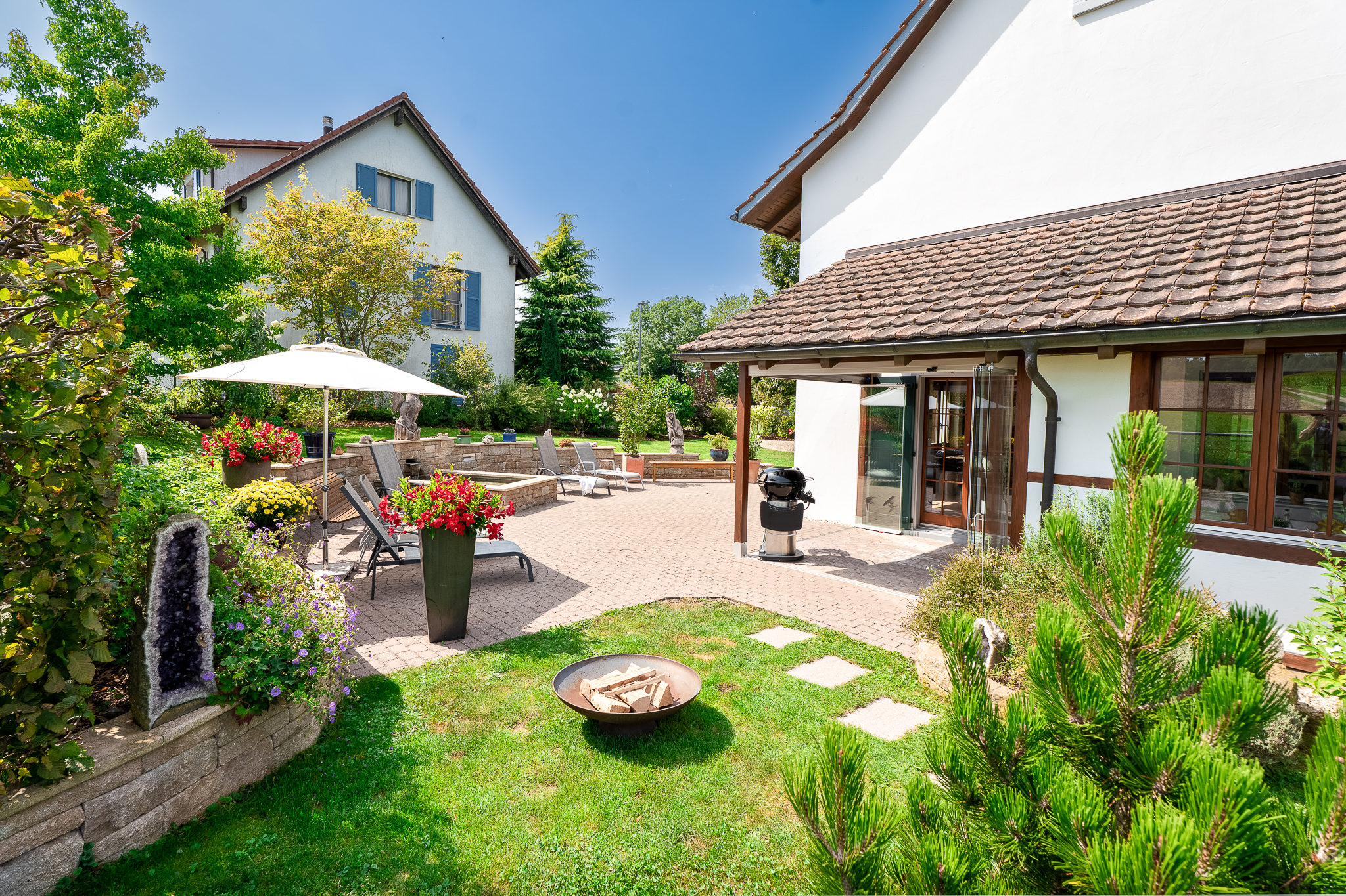 Der Aussenbereich präsentiert sich als weitläufiges, geschmackvoll gestaltetes und sehr gepflegtes Gesamtkunstwerk. Der Garten ist üppig bepflanzt und komplett eingezäunt. Ein grosser Sitzplatz fehlt ebenso wenig wie ein Wintergarten, Rasenflächen und ein Gartenhaus. Der grosszügige Brunnen lädt zum Plantschen ein. Für Ihre Fahrzeuge stehen vier Aussenparkplätze und eine Garage zur Verfügung.
