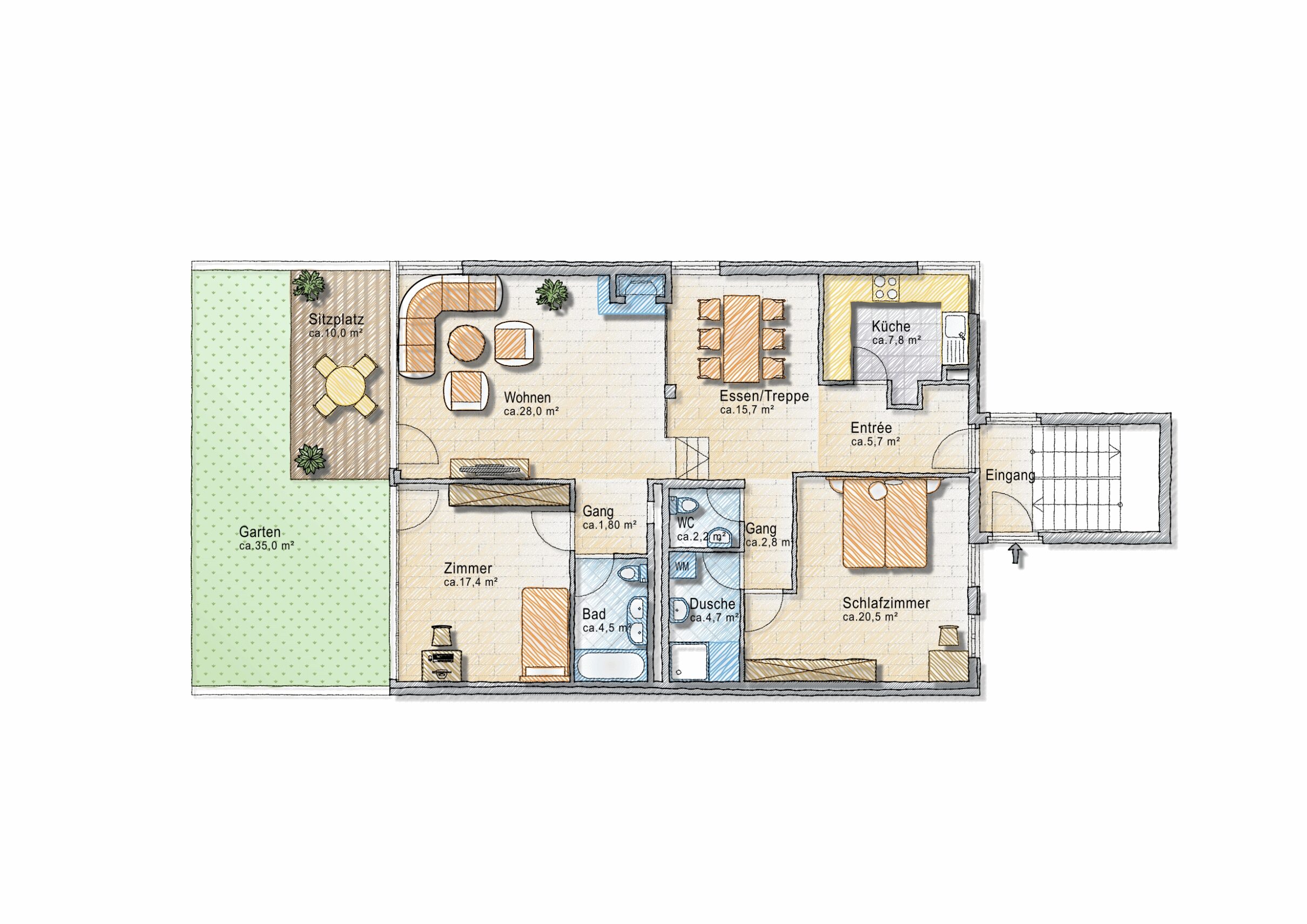 3.5-Zimmer-Gartenwohnung, Ausbaumöglichkeit für 4.5-Zimmer-Wohnung