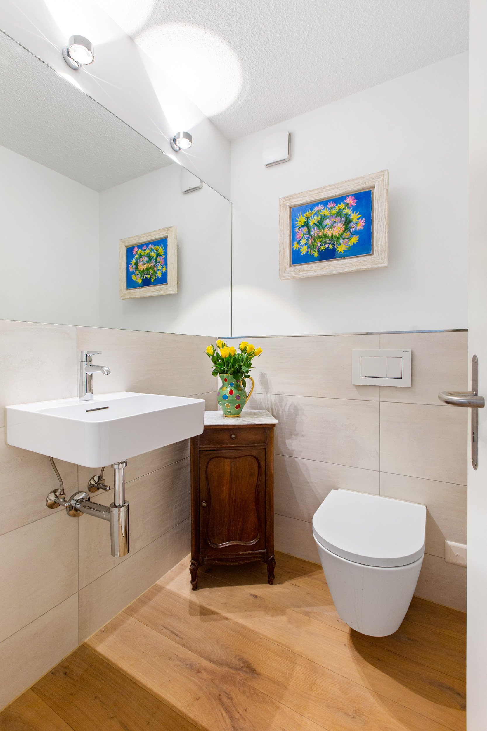 Jeweils auf einer eigenen Ebene gelegen, verfügen beide Schlafzimmer über ein Bad direkt neben dem Raum – ein durchdachtes Konzept, das Privatsphäre und zwei persönliche Rückzugsorte schafft . Das ist ideal für Paare, Wohngemeinschaften oder kleine Familien, die Wert auf Individualität legen. Das untere Zimmer bietet direkten Gartenzugang. Das obere, das aus zwei Räumen zusammengeführt wurde, lässt sich bei Bedarf wieder trennen. Eine zusätzliche Gästetoilette und praktische Einbauschränke erhöhen den Wohnkomfort.