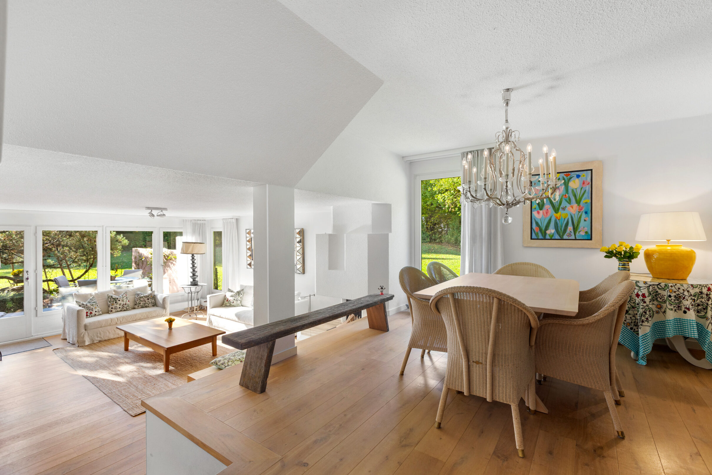 Vom Eingangsbereich aus ist die geräumige und gut ausgestatete Küche mit edler Granitabdeckung und Blick ins Grüne zugänglich. Der offene Ess- und Wohnbereich ist in zwei Halbgeschosse gegliedert, verbunden durch einen sanften Höhenversatz. Dadurch entsteht eine spannende Raumwirkung mit Tiefe und Struktur.