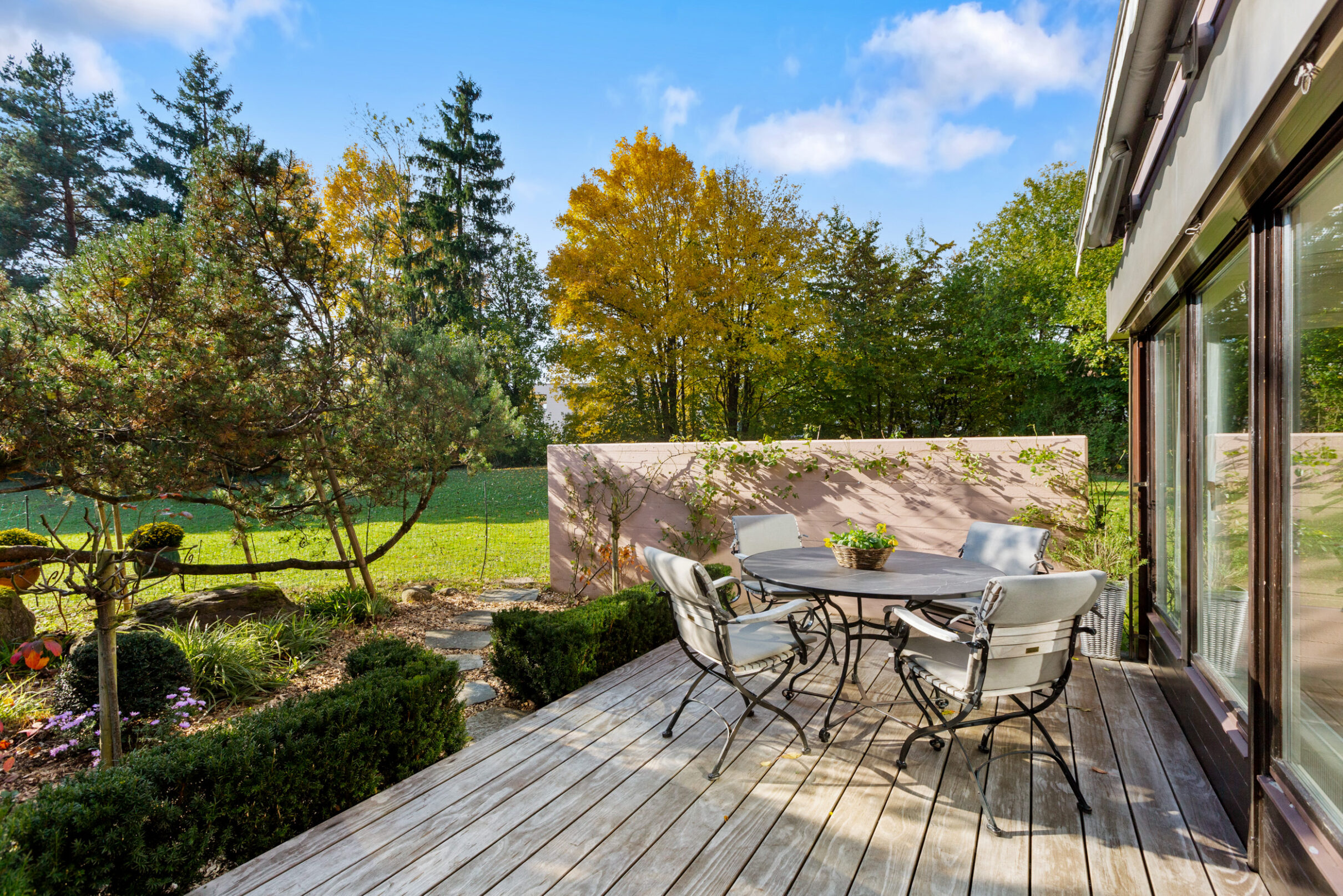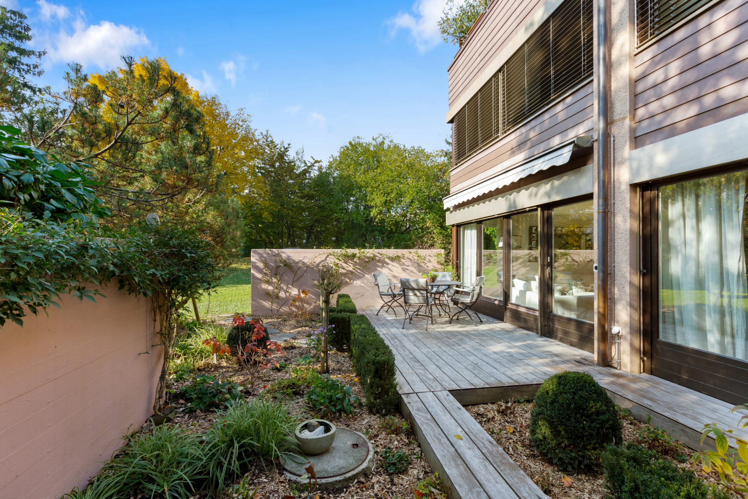 Vom Wohnzimmer führt der Weg hinaus auf die sonnige Terrasse und in den liebevoll gestalteten, üppig bewachsenen und romantischen Garten. Die private, grüne Oase grenzt an die Wiese des grossflächigen Gemeinschaftsgartens mit Spielplatz und gewährt einen Blick auf den nahe gelegenen Wald.
