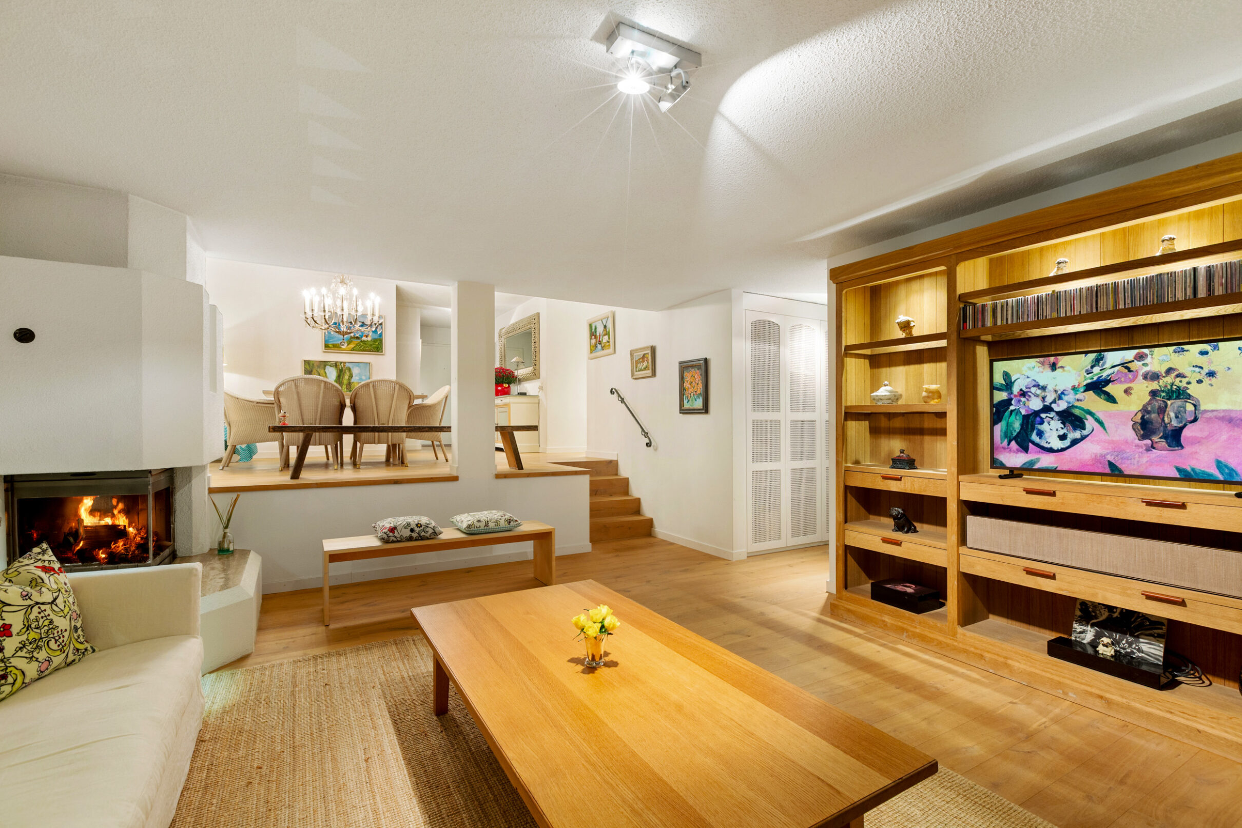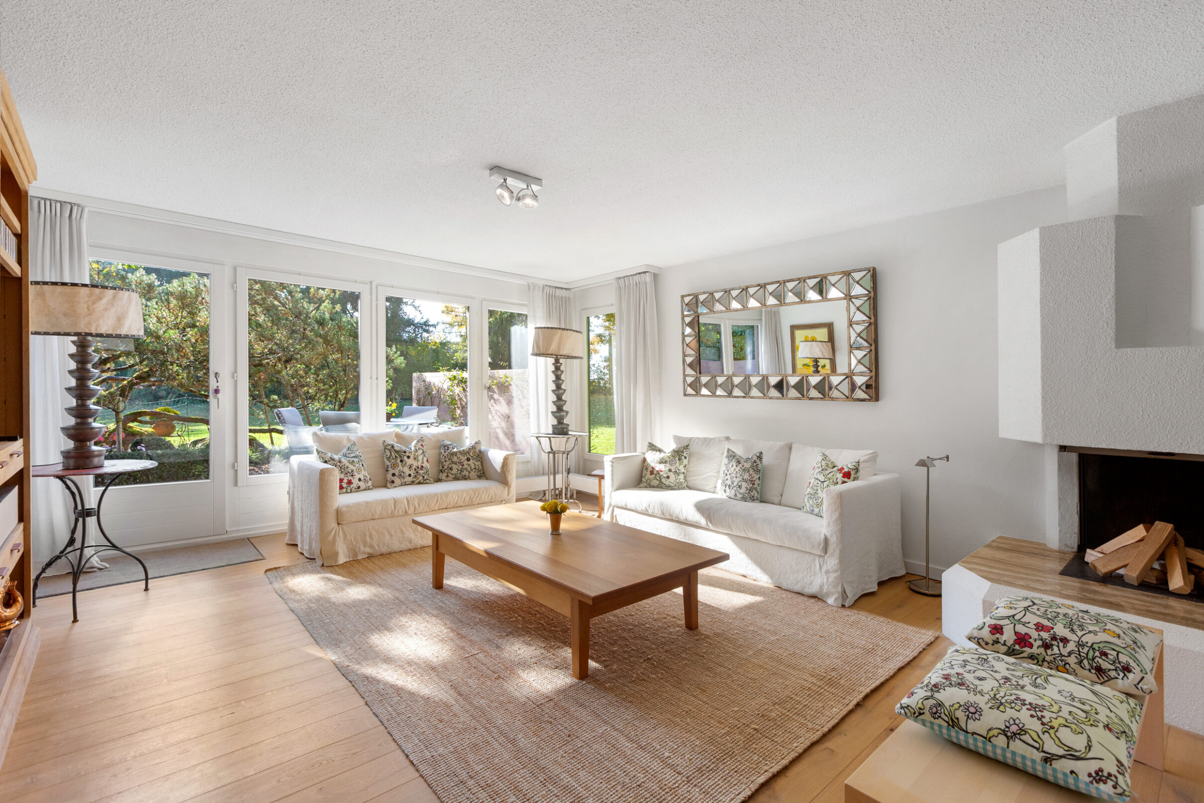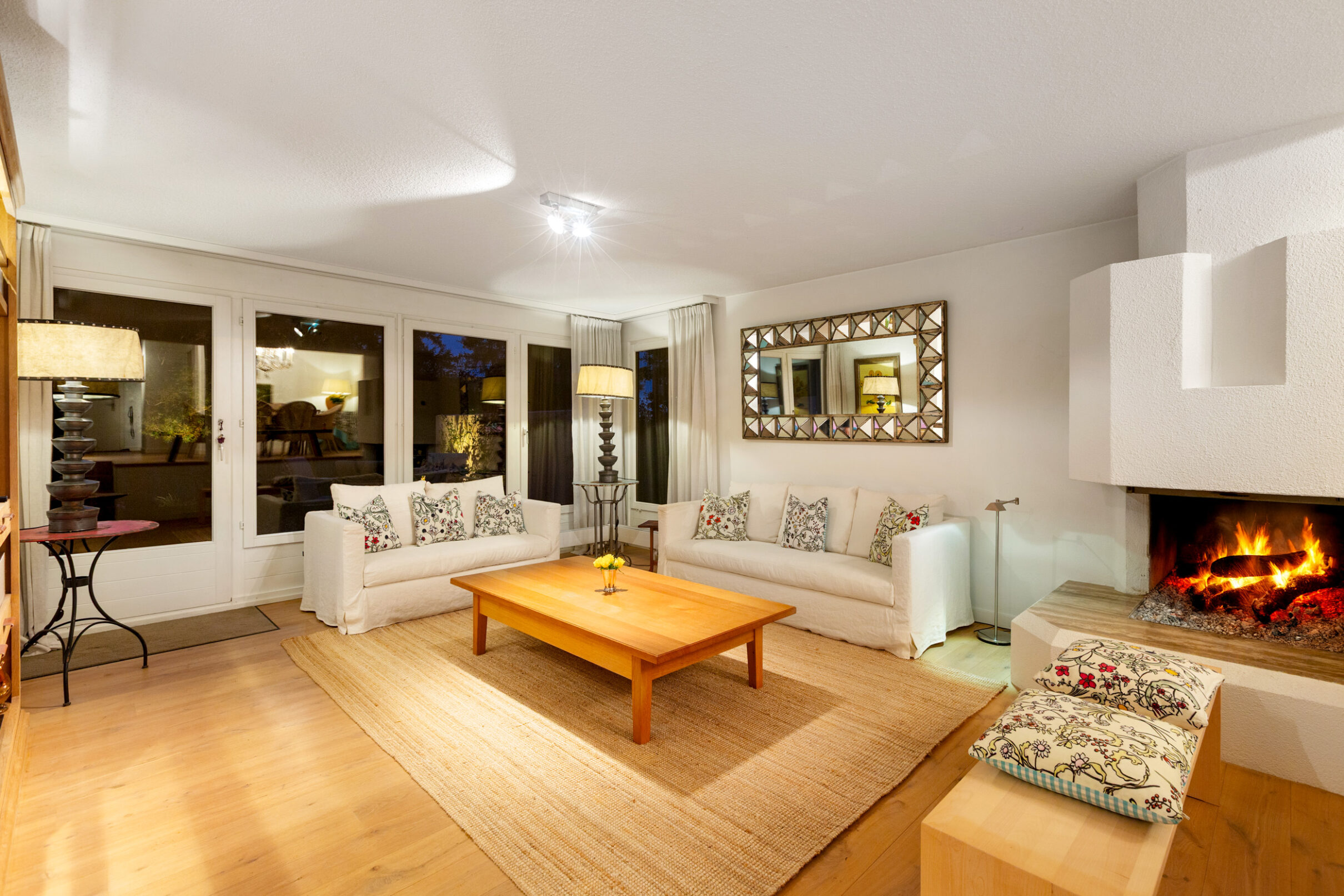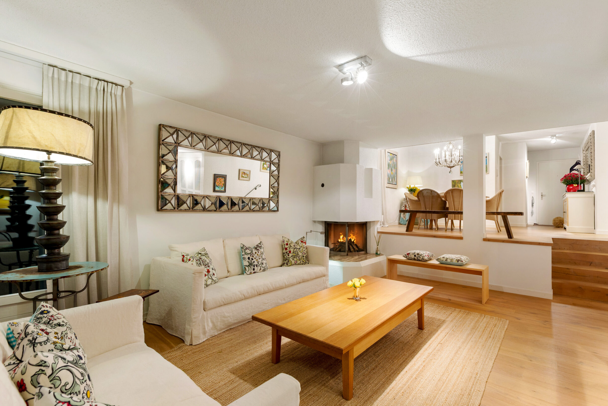 Die besondere Atmosphäre wird durch den durchgehend verlegten, geölten Parkettboden aus Weisseiche unterstrichen. An kalten Winterabenden sorgt das Cheminée im Wohnzimmer für Behaglichkeit.