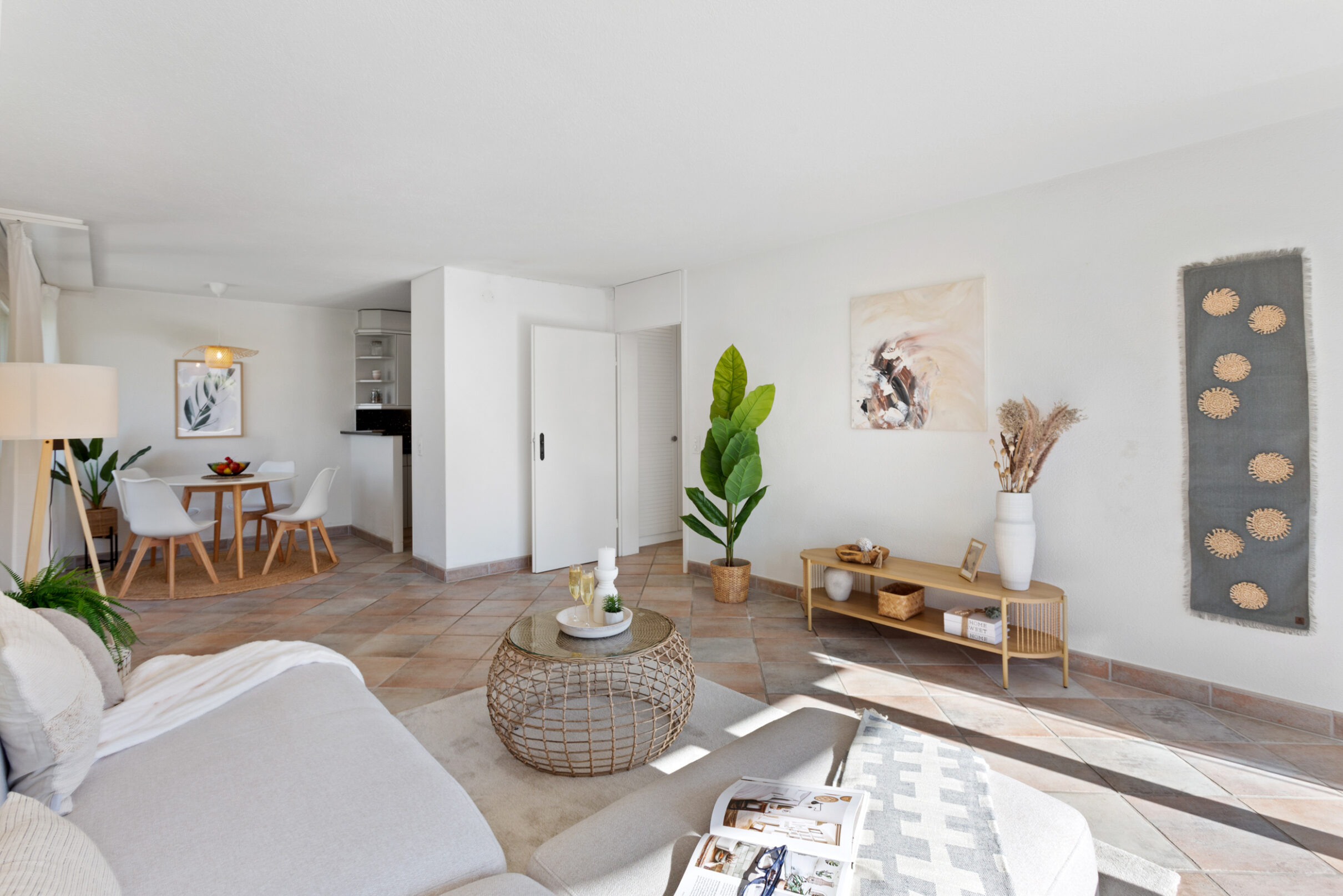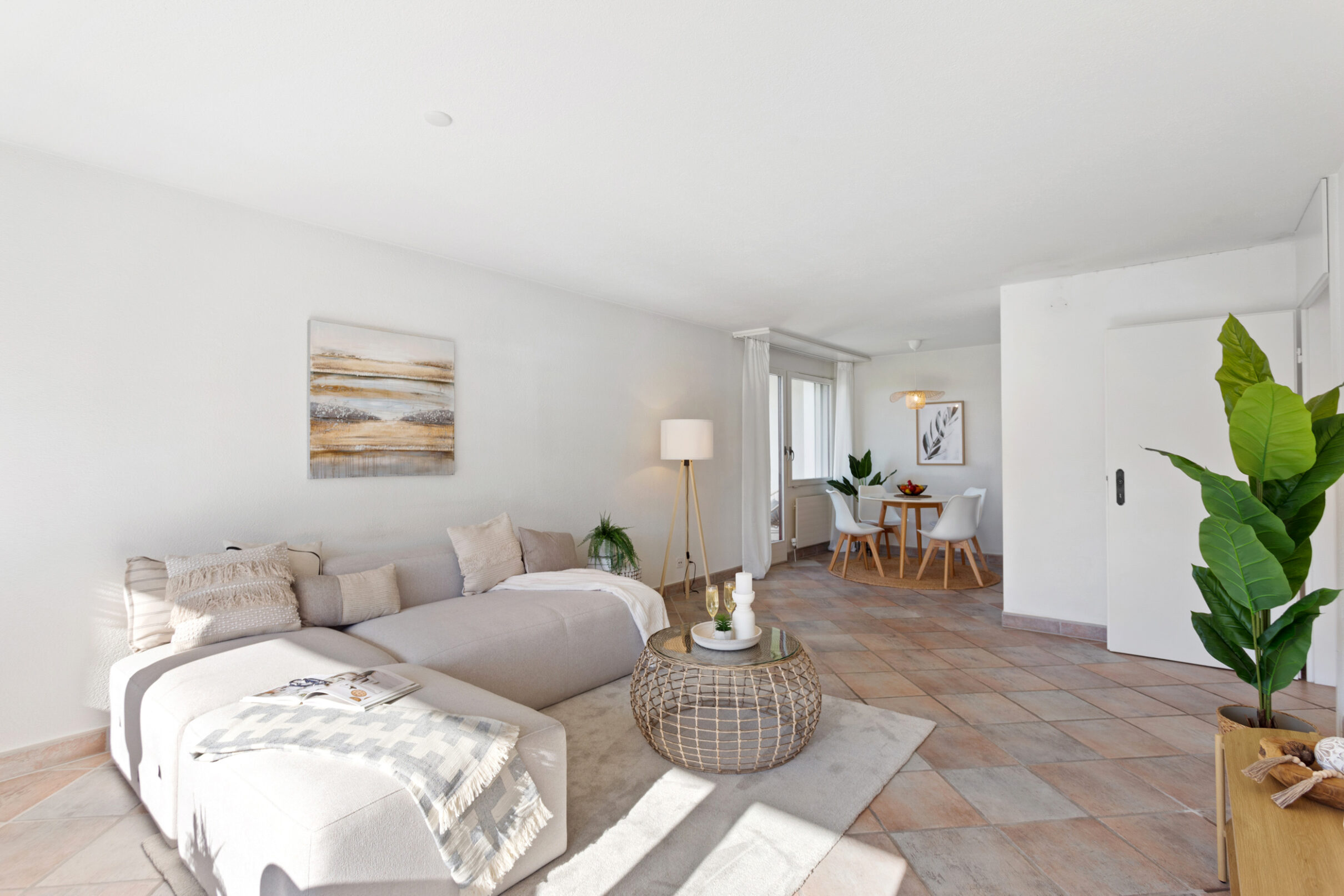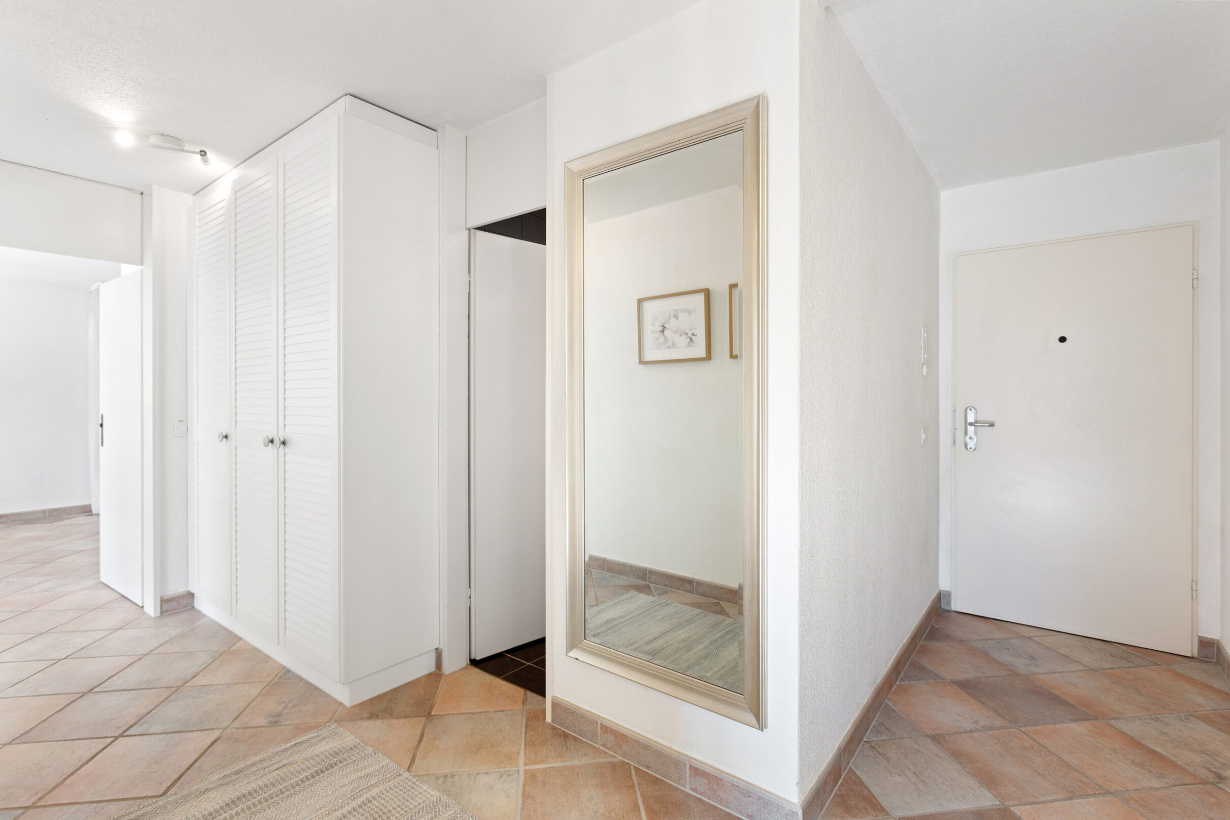 Ihr Auto findet in der hauseigenen Tiefgarage bequem Platz. Zwei unterschiedlich dimensionierte Lifte bringen Sie barrierefrei direkt bis vor den Wohnungseingang. Der Eingangsbereich geht fliessend in einen L-förmigen Korridor über, der – wie die gesamte Wohnung – mit einem Plattenboden in warmen Erdtönen ausgelegt ist. Der durchdachte Grundriss schafft eine klare Trennung zwischen dem Wohnbereich und den privaten Rückzugszonen. Gleich beim Eingang befindet sich ein praktisches Reduit. Im Anschluss folgen zwei Schlafzimmer: das geräumige Hauptschlafzimmer sowie ein weiterer, etwas kleinerer Raum, der sich als Kinder-, Gäste- oder Arbeitszimmer eignet. Gegenüber den Schlafräumen liegt das kompakte Badezimmer mit grosszügiger Dusche.