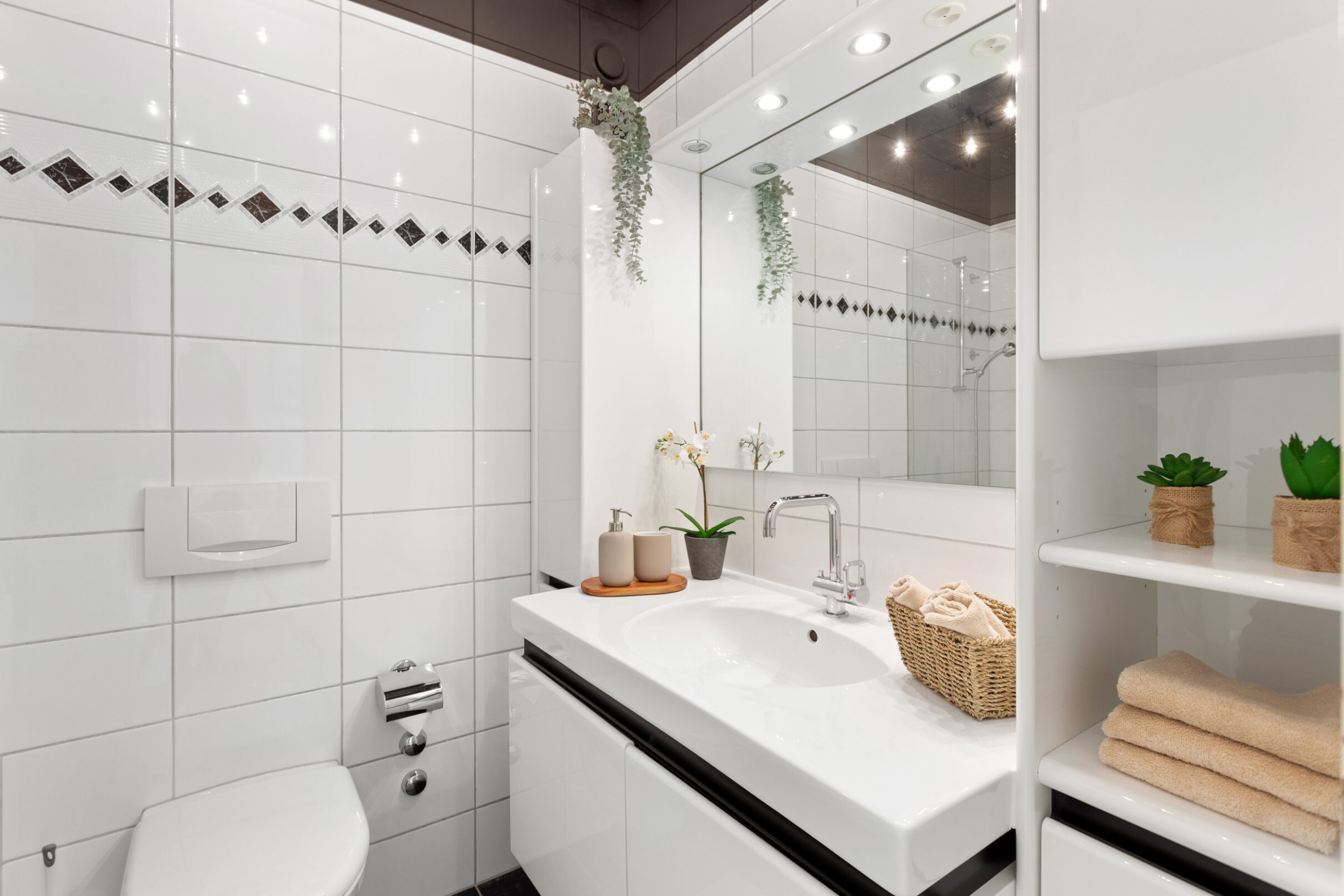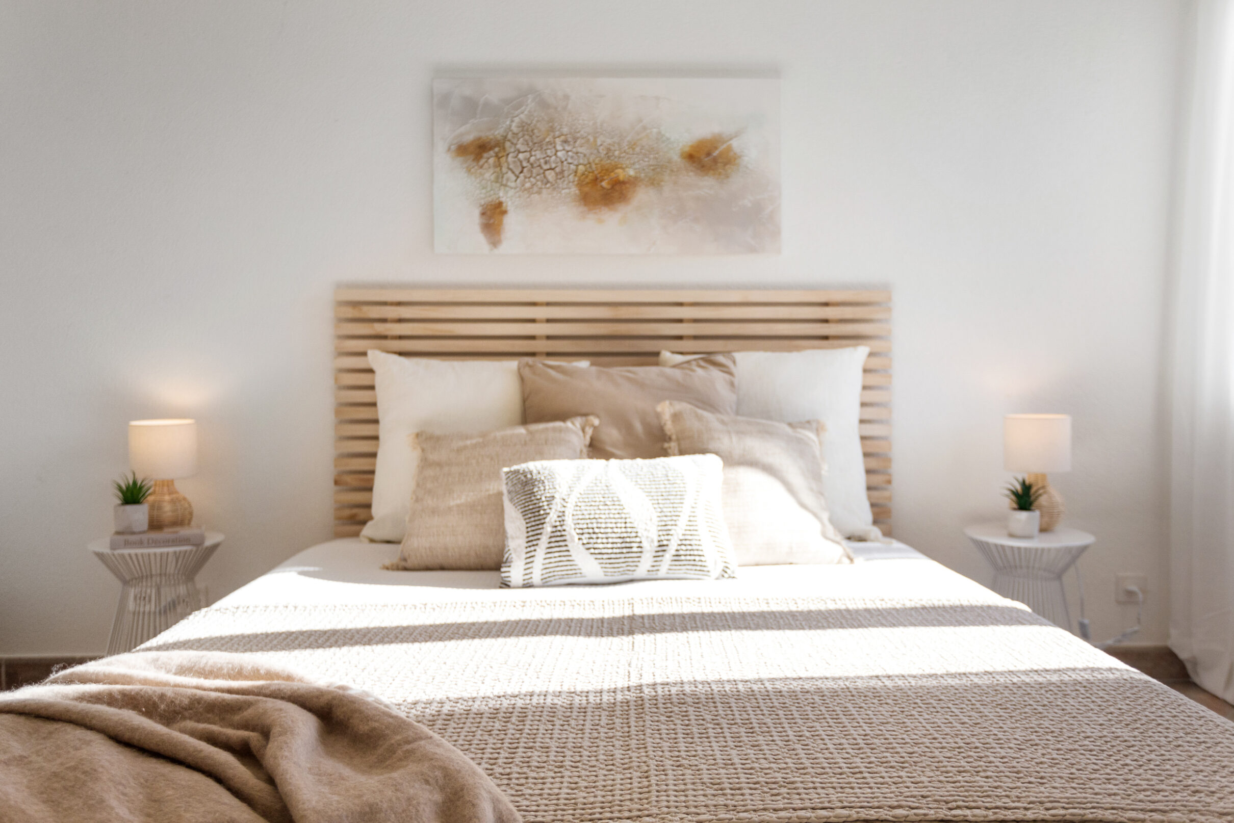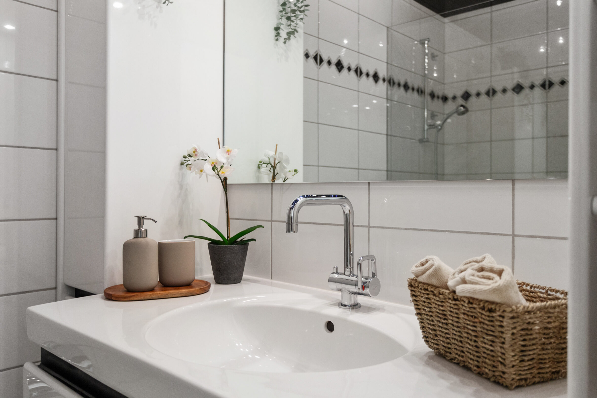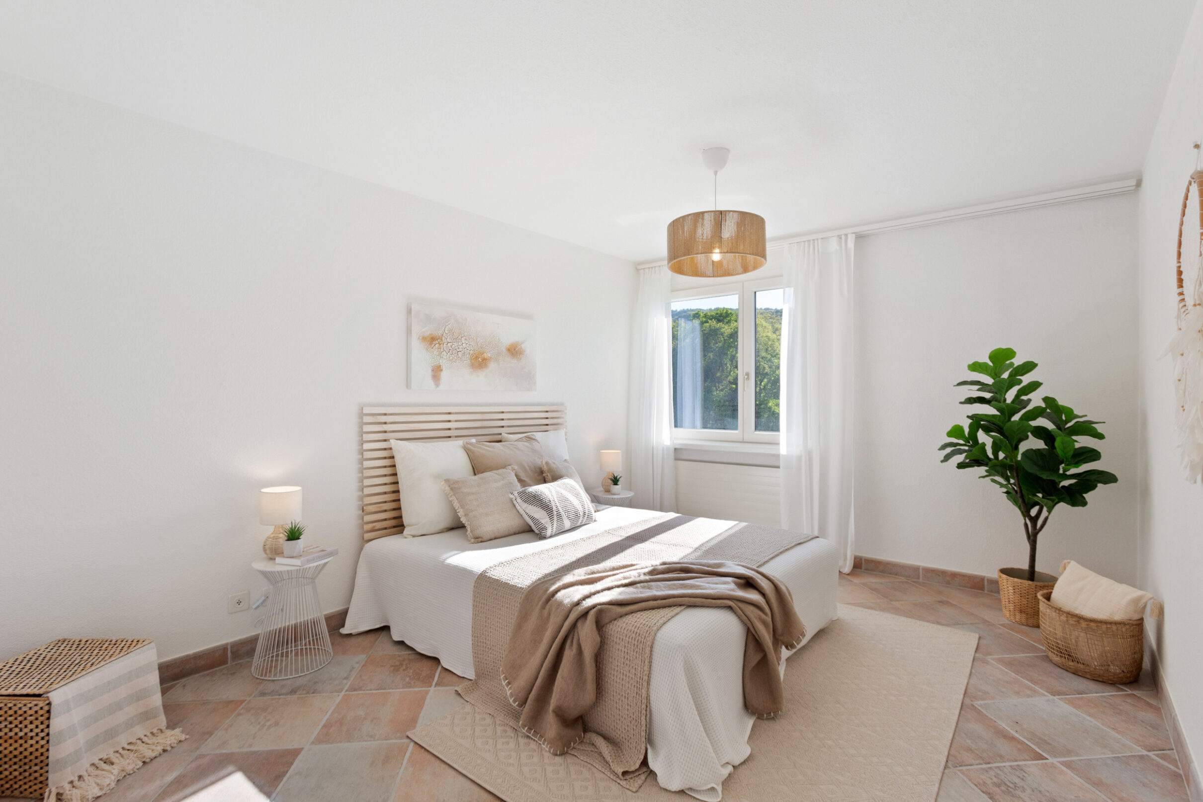 Ihr Auto findet in der hauseigenen Tiefgarage bequem Platz. Zwei unterschiedlich dimensionierte Lifte bringen Sie barrierefrei direkt bis vor den Wohnungseingang. Der Eingangsbereich geht fliessend in einen L-förmigen Korridor über, der – wie die gesamte Wohnung – mit einem Plattenboden in warmen Erdtönen ausgelegt ist. Der durchdachte Grundriss schafft eine klare Trennung zwischen dem Wohnbereich und den privaten Rückzugszonen. Gleich beim Eingang befindet sich ein praktisches Reduit. Im Anschluss folgen zwei Schlafzimmer: das geräumige Hauptschlafzimmer sowie ein weiterer, etwas kleinerer Raum, der sich als Kinder-, Gäste- oder Arbeitszimmer eignet. Gegenüber den Schlafräumen liegt das kompakte Badezimmer mit grosszügiger Dusche.